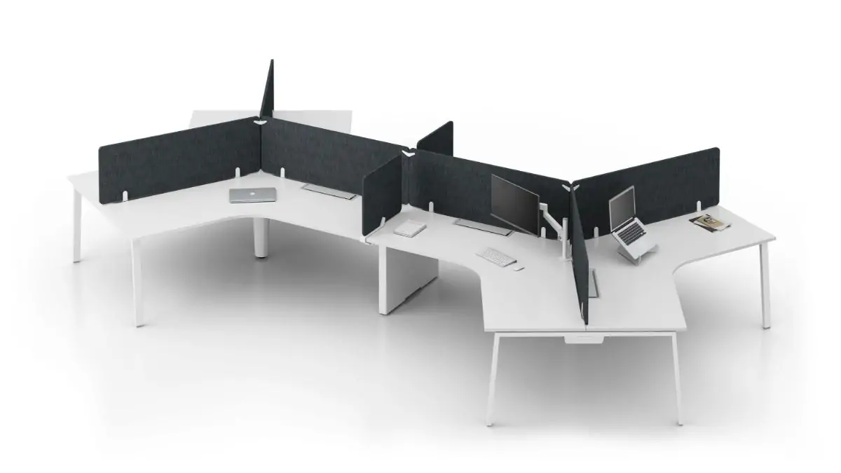 Specify Byne System with a number of different screen types, or go screen-less for a collaborative setting. Choose from desk-up screens, suspended screens, lateral screens, toolbar-mounted screens and modesty screens in fabric, glass or acrylic. Framed or frameless screens, plus pinnable or tackable surfaces, are also available.