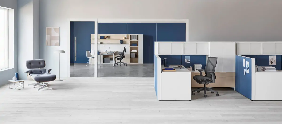 The innovative Canvas Office Landscape from Herman Miller transforms your office with seamless functionality. The Canvas Private Office offers a sanctuary amidst the hustle, tailored to diverse work styles. Whether outfitting an existing office or creating private spaces in an open area, you can create a wide range of distinct areas using storage and panels without the need for new construction.