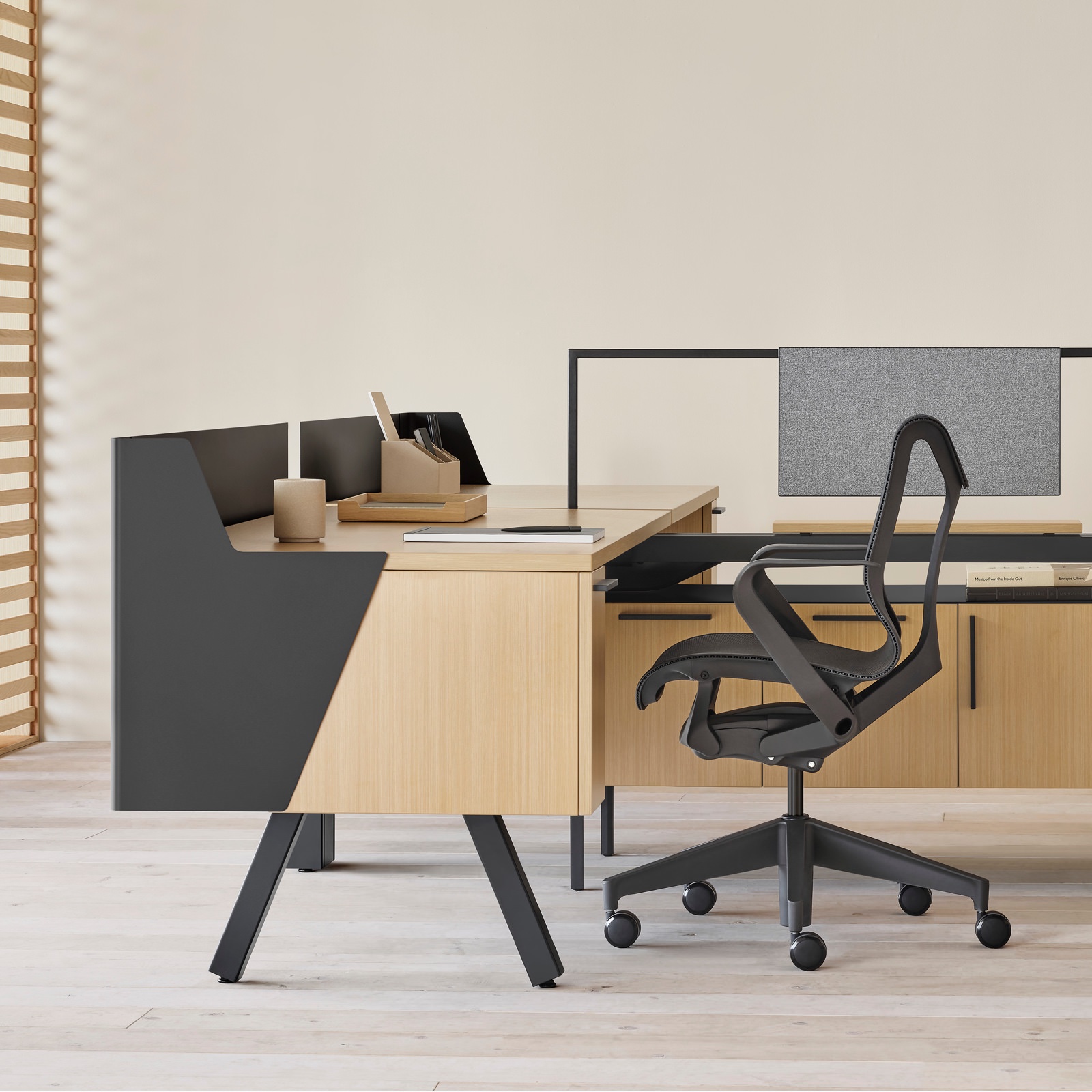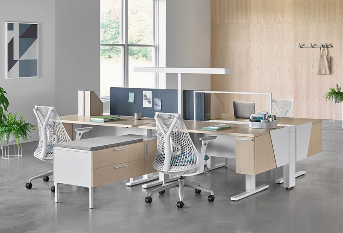When workspaces are designed efficiently with people in mind, you feel less cramped and distracted. Move inserts into and out of the open-frame screens to dial in the privacy, stow away personal items in purposeful storage, and use T-shaped lights to imply boundaries.