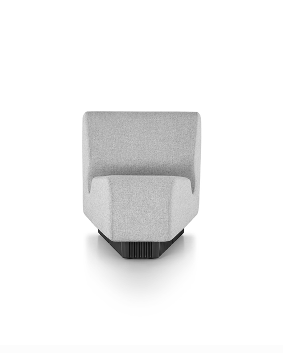 Five simple units, each a moulded, sculptured shape that offers support with a soft look, allow the system to take on a multitude of forms. Deep pockets in the back let air circulate around the sitter and make for easier cleaning. Available in a variety of textiles, each piece has fully upholstered front, back and sides, so it can serve as an end, interior or solo seat, no matter the arrangement. Units link together securely with simple connectors, and unlock for quick rearrangement.