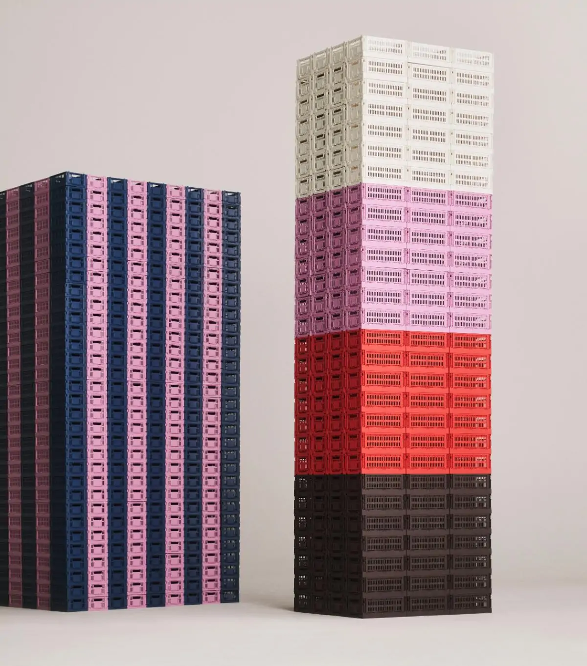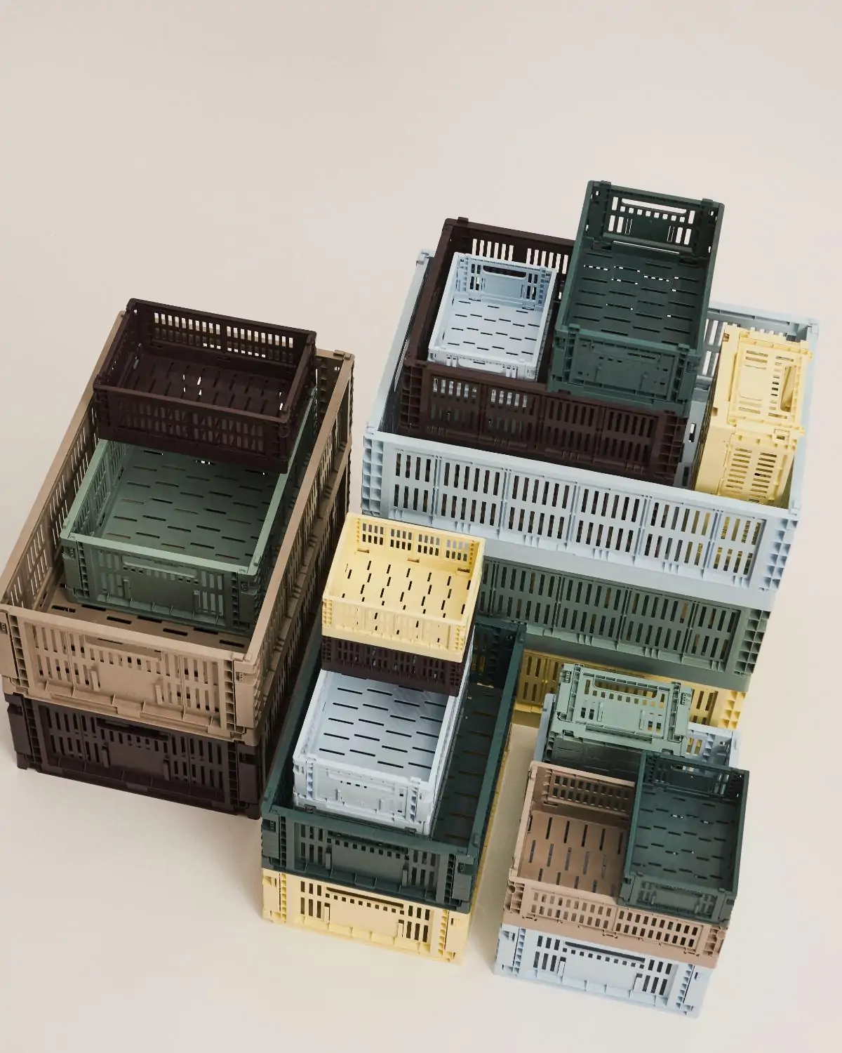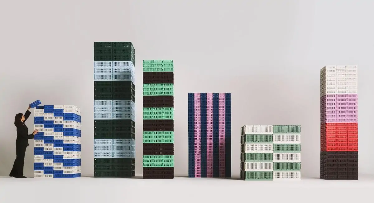 HAY’s Colour Crate is a series of handy, adaptable storage boxes with a perforated design. Made from 100% recycled post-consumer plastic, these stackable crates come in cubes, squares, and rectangles in a wide variety of colours and sizes. They can be supplemented with lids and wheels, and placed inside each other in multiple configurations, making them ideal for storage, display, and even innovative furniture items. Their multifunctionality, combined with their ability to be folded flat when not in use, makes them a versatile and space-saving storage solution.