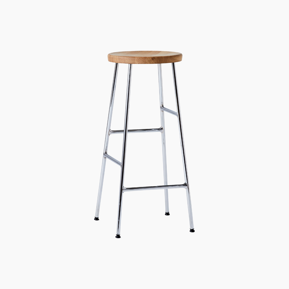 The Cornet Stool from HAY combines innovation and sophistication. Using a unique steel tube construction inspired by bicycle racks, this stool features footrests at different heights on each side to accommodate diverse users. It comes in bar- and counter-heights and features a solid wood seat for a sleek balance of form and function. Choose from various wood finishes and chrome or powder-coated legs to complement any setting, whether office, lounge, or dining space.