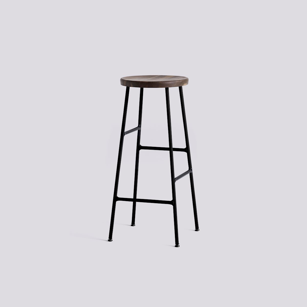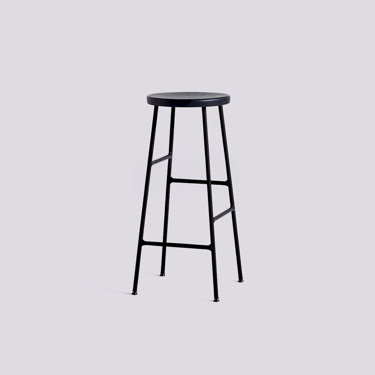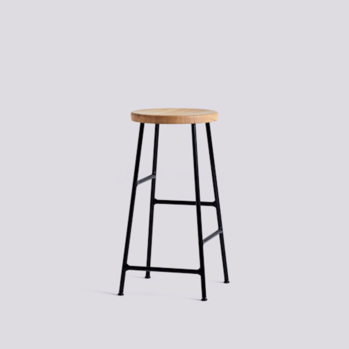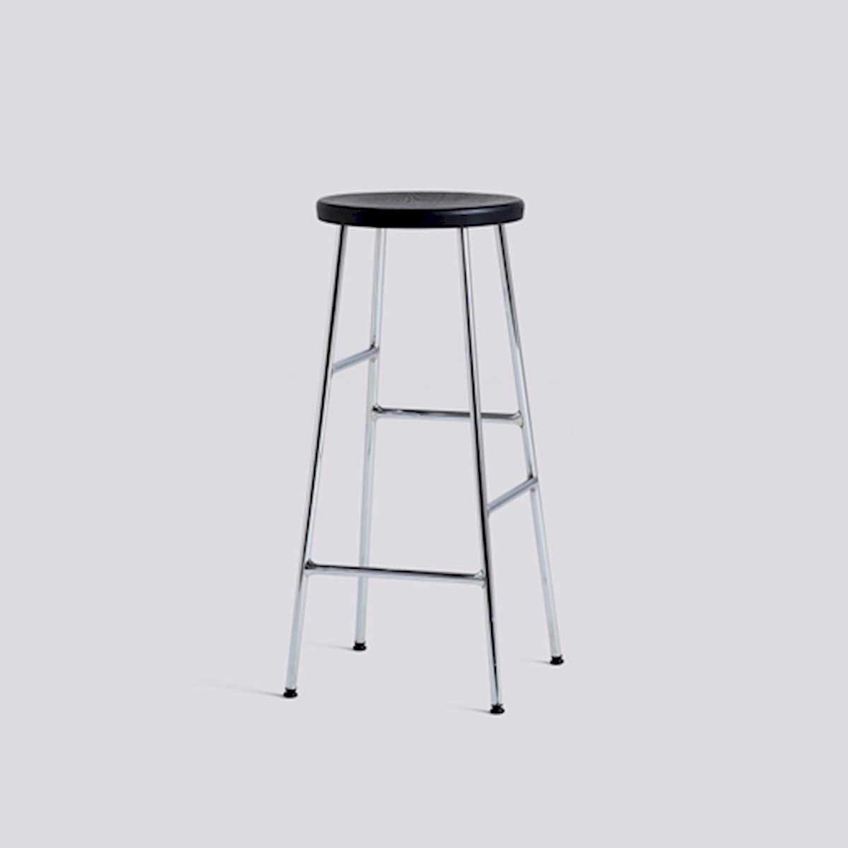 The Cornet Stool from HAY combines innovation and sophistication. Using a unique steel tube construction inspired by bicycle racks, this stool features footrests at different heights on each side to accommodate diverse users. It comes in bar- and counter-heights and features a solid wood seat for a sleek balance of form and function. Choose from various wood finishes and chrome or powder-coated legs to complement any setting, whether office, lounge, or dining space.