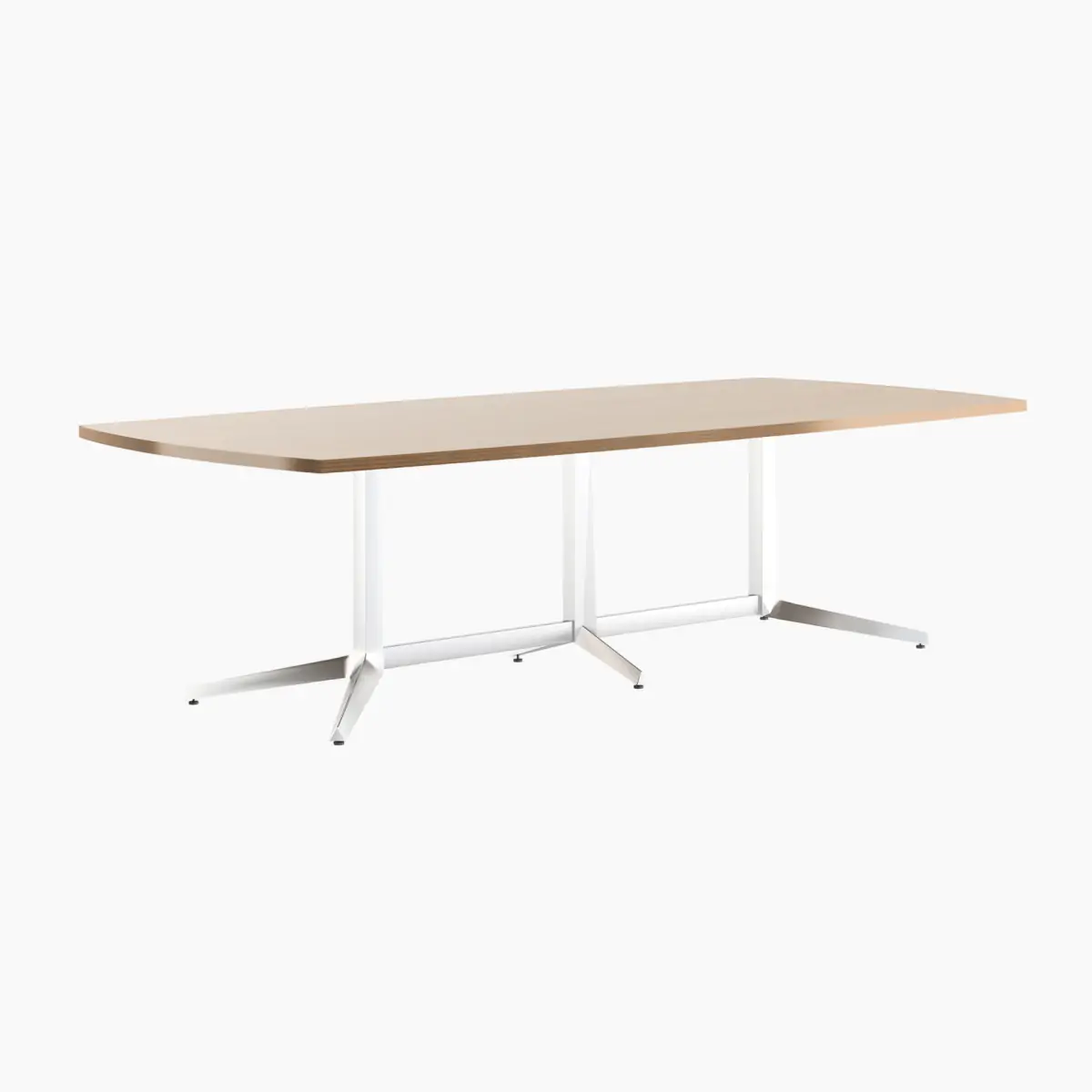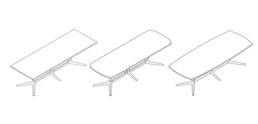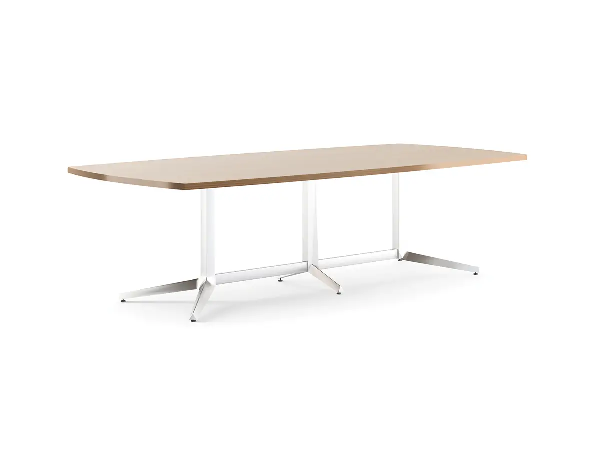 Dividends Horizon conference tables are available in racetrack, rectangular, or boat shape and in all standard Dividends Horizon finishes. A conference table base assembly includes two Y legs, one center support T base, and two horizontal stretchers that connect the three bases.