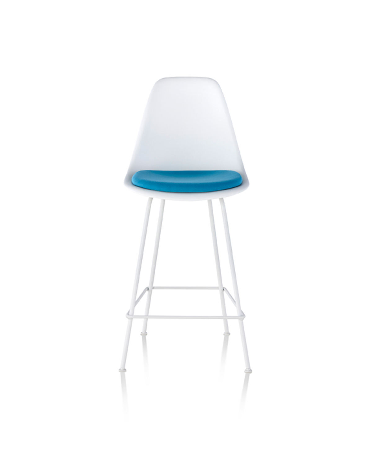 Charles and Ray Eames’ career-long exploration of the chair as a single-shell form yielded numerous expressions, beginning in 1950 with the Molded Fiberglass Chairs. Most recently, the Molded Plastic Shell evolved to include 100 percent recycled plastic. Atop a 4-leg bar- or counter-height base, the durable shell chairs make spaces more inviting and stylish. Beyond the growing selection of plastic shell colors, Eames Molded Plastic Stools are also available fully upholstered or with a seat pad for enhanced comfort.