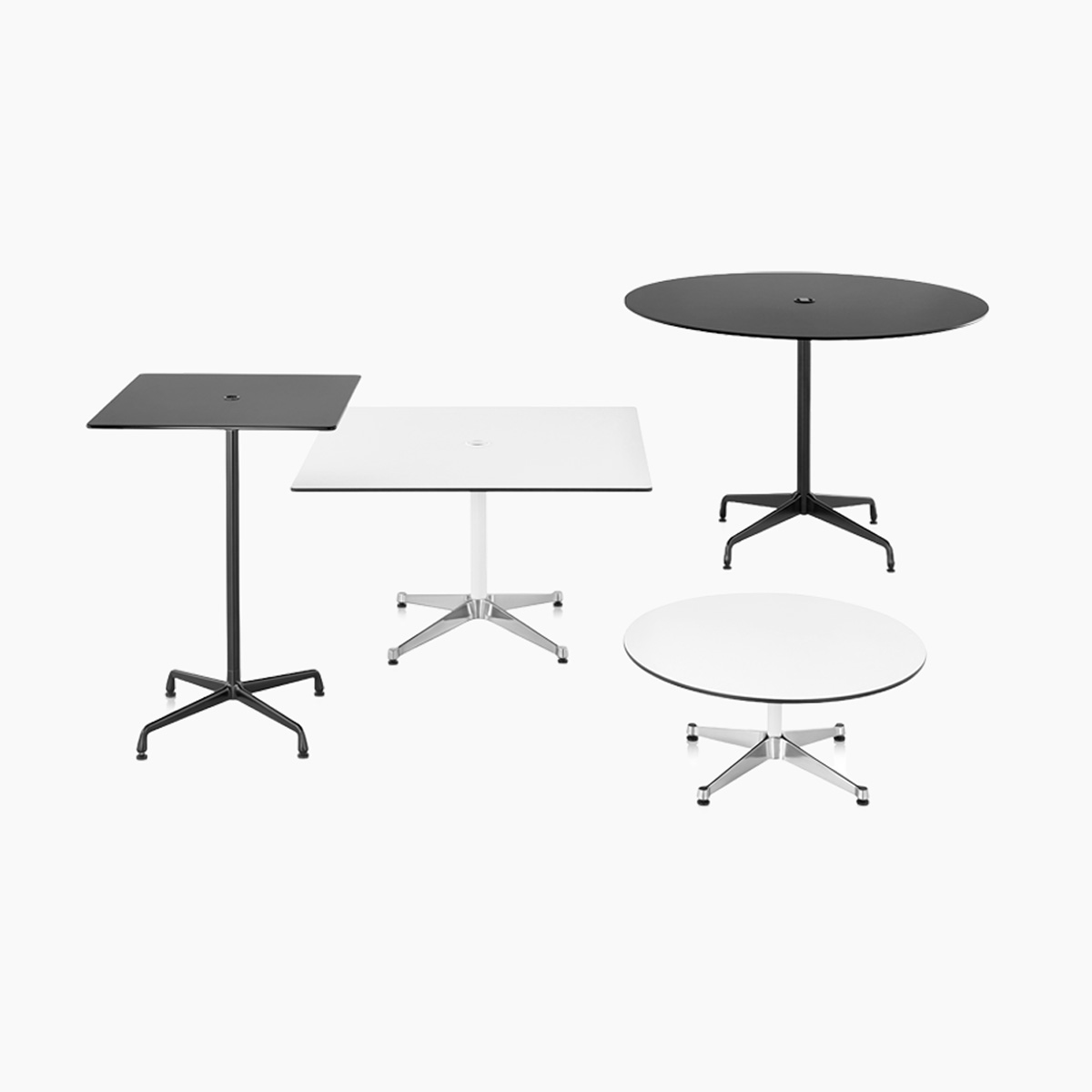 Strength and simplicity define the Eames Tables from Herman Miller. They’re offered in a range of heights, materials, and finish options, with optional inset power outlet integration. Round grommets guide cables under the tabletop and within the column and base where they’re hidden for a clean aesthetic.