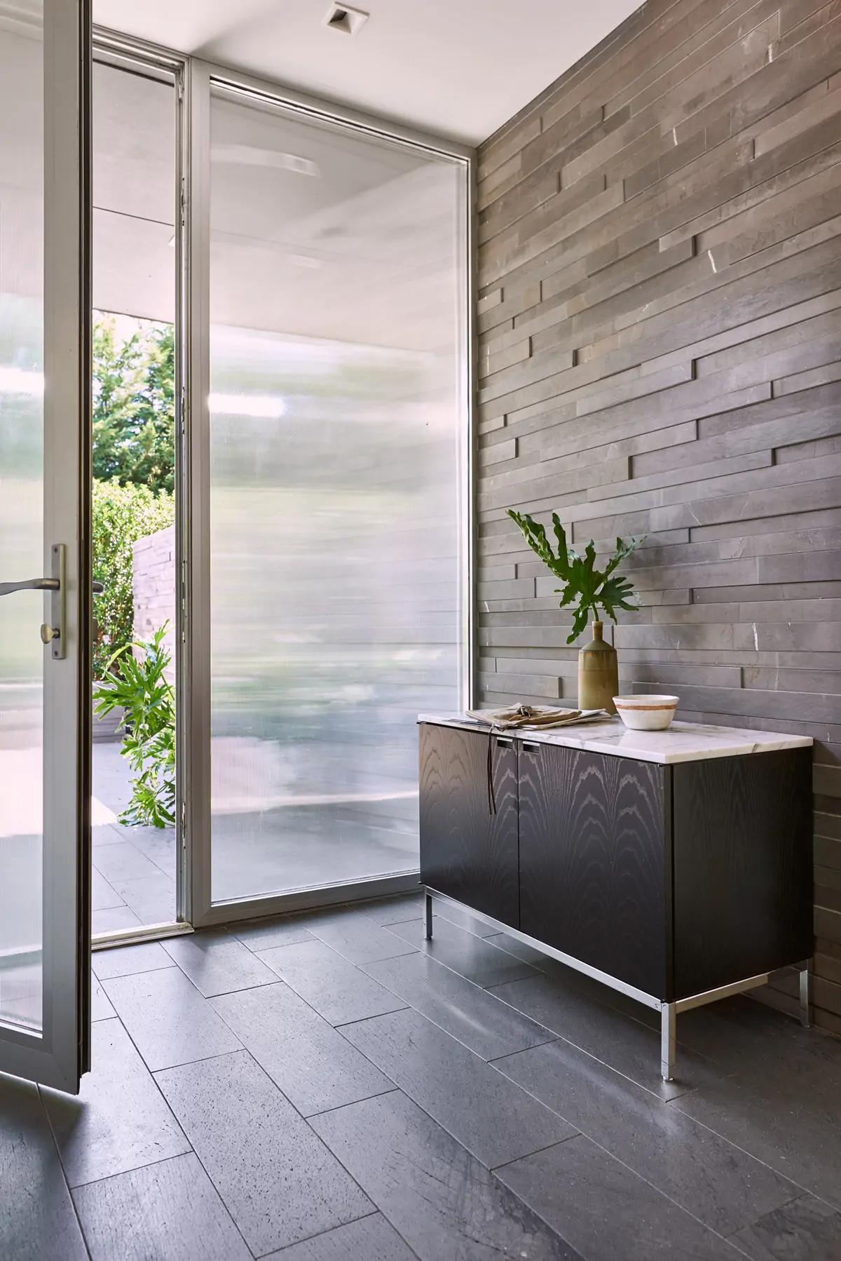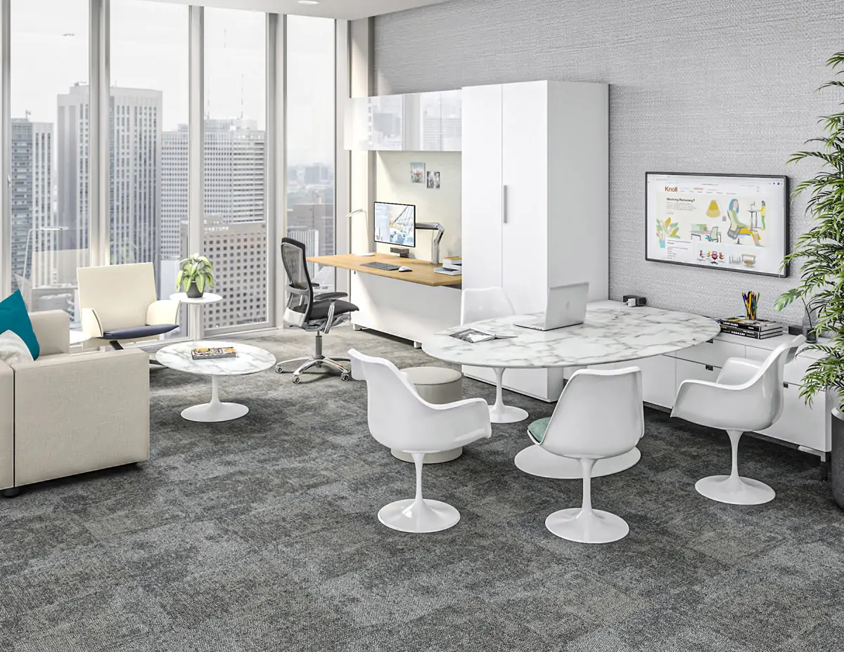 Seeking to create a space better suited to the executive’s primary function — communication — Florence reconsidered the layout from an architectural perspective. She replaced an imposing, diagonal desk with the more inviting table desk, placed parallel to the back wall. Storage was moved to behind the table in a low, matching credenza.