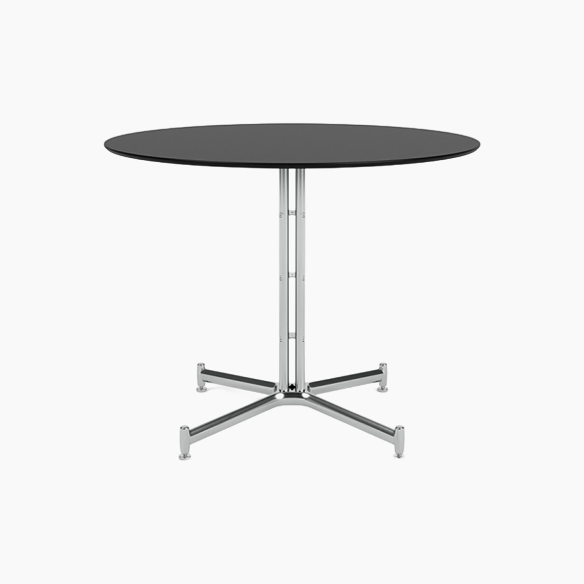 The Iquo Café Table features an elegant pedestal base, made of four vertical tubes, that provides wire management for power use and is intentionally flat where it meets the floor for comfortably resting your feet.
