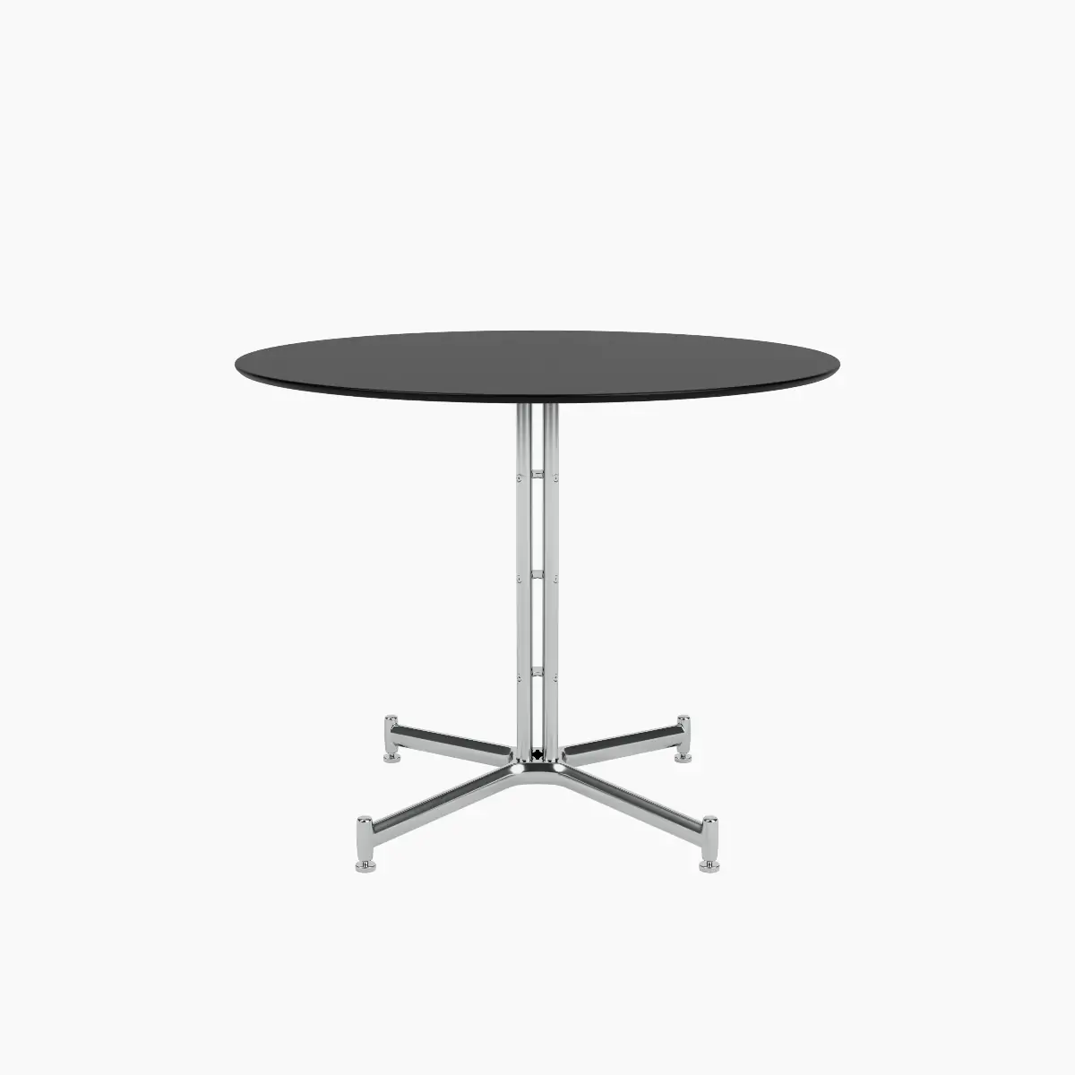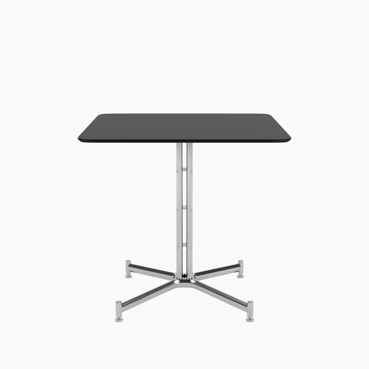 The Iquo Café Table features an elegant pedestal base, made of four vertical tubes, that provides wire management for power use and is intentionally flat where it meets the floor for comfortably resting your feet.