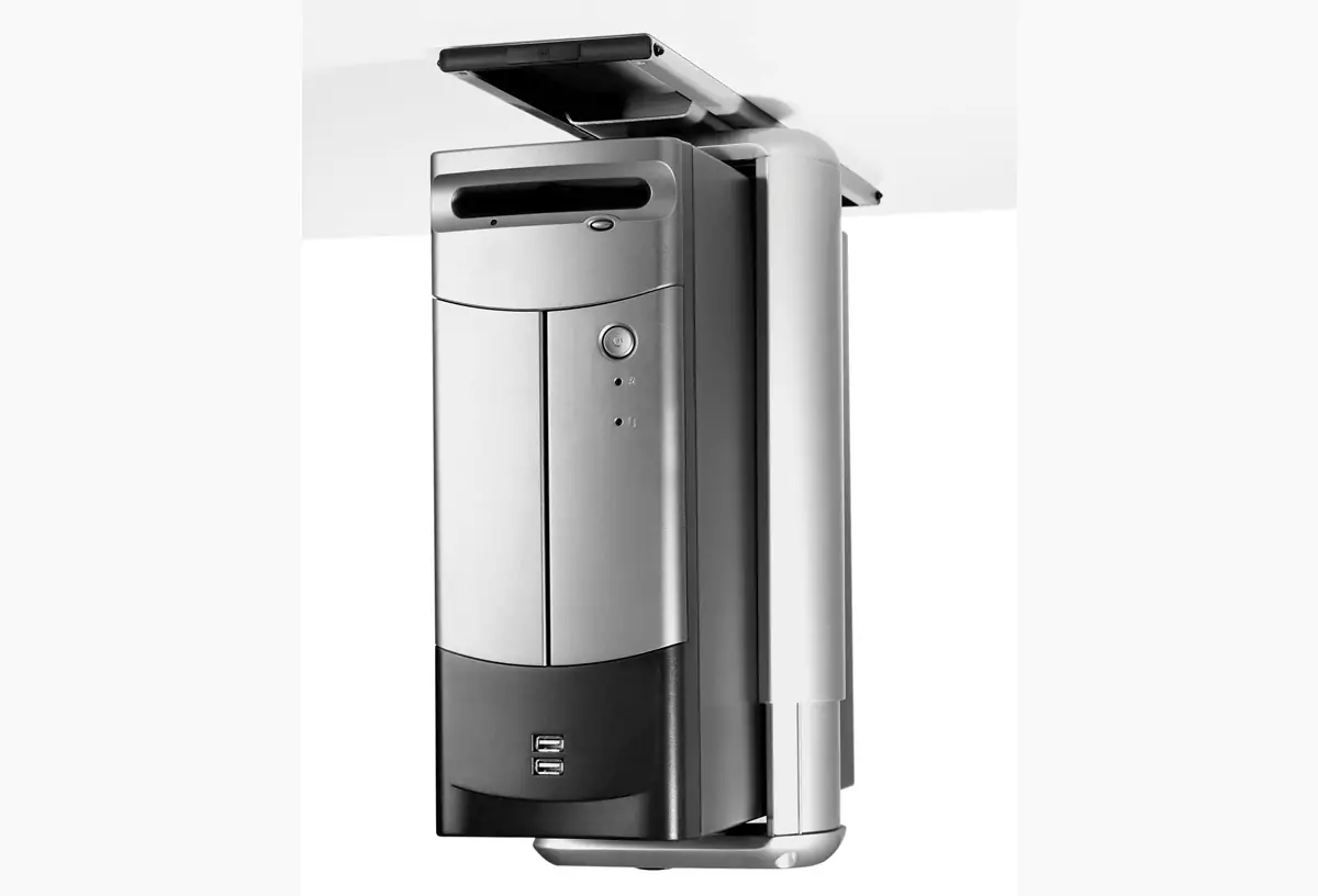 The Jaw CPU Holder by Herman Miller floats aesthetically under the desk surface. The aluminum body clamps the top and bottom of the CPU to secure it in place. Using a slide-and-rotate kit, the support can be easily moved to increase leg space. Sustainably designed, much of its material is recyclable at the end of its long life.