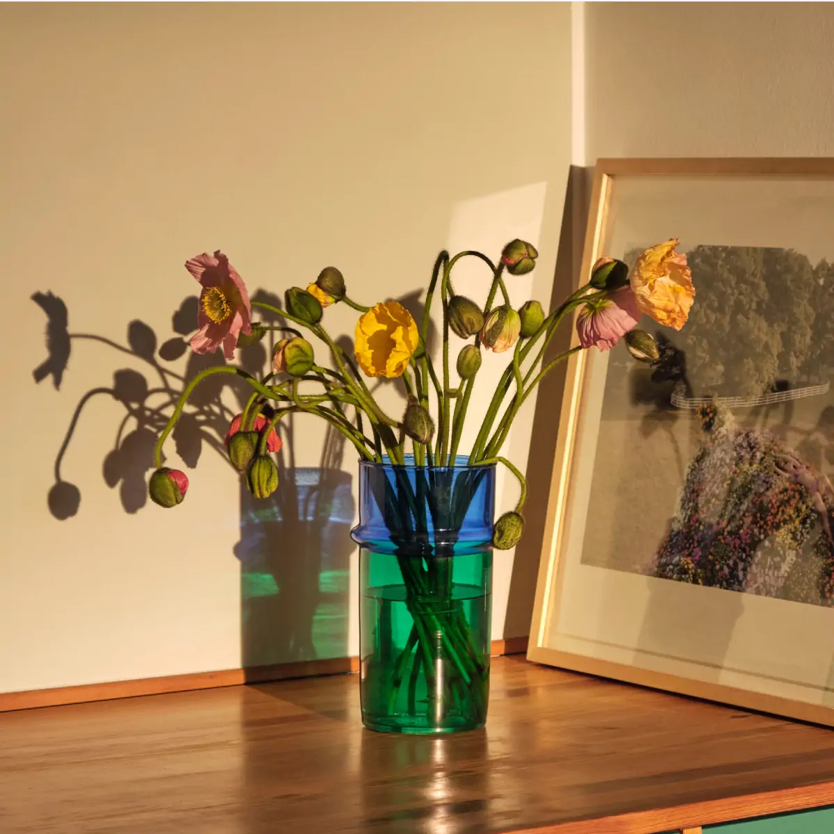 Hand-blown in Morocco, these painted glass vases are an easy way to add a pop of colour to a room. Crafted from recycled glass, they are available in different sizes in a variety of monocoloured or colour-blocked designs.