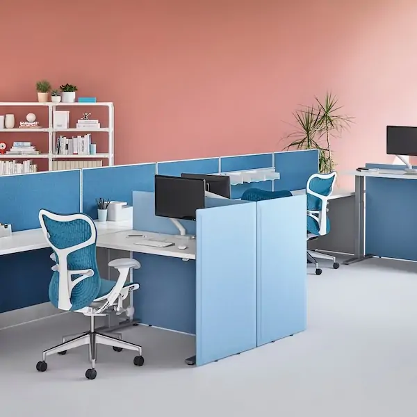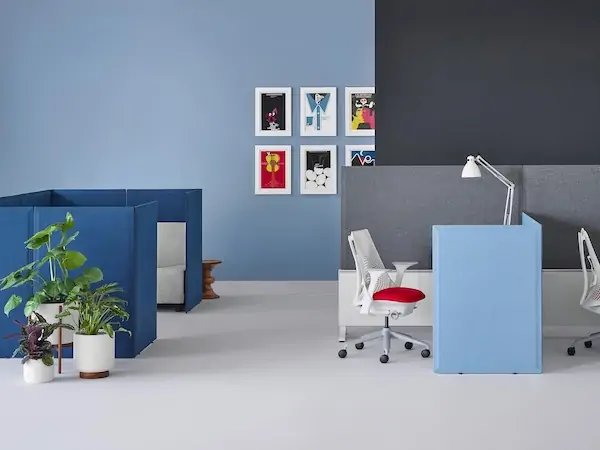 The privacy screens are tackable and share a frameless, thin profile, with complementary colors, providing a consistent aesthetic across settings and work with any Herman Miller product.