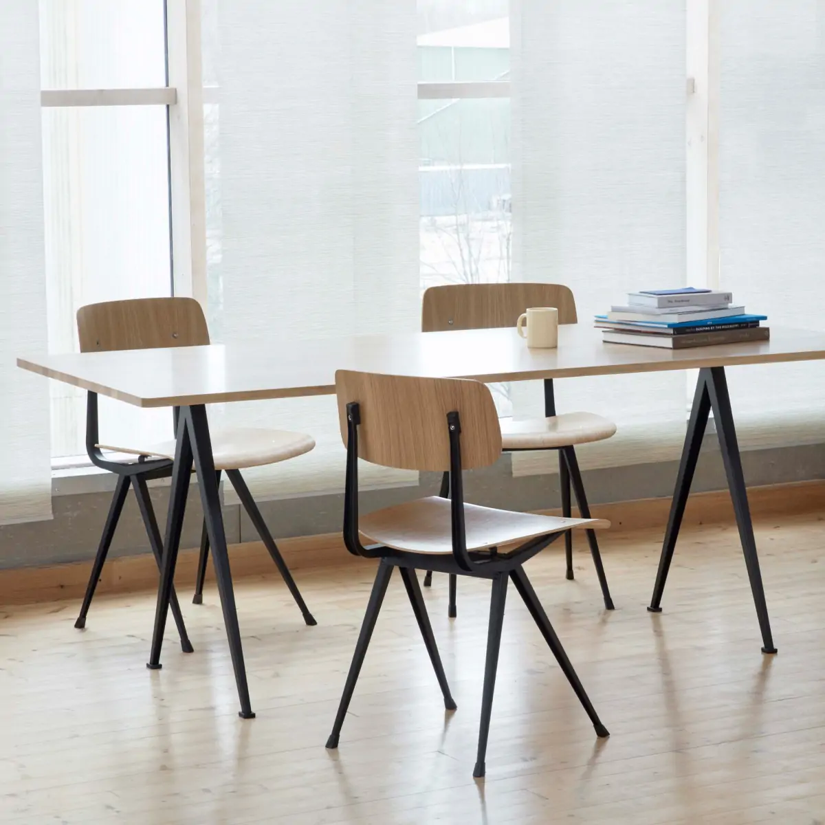 Designed to be functional, light and strong, the Pyramid Table features a steel-sheet base with a rectangular oak tabletop. Originally created by Wim Rietveld while working at Ahrend in the 1950s, the cutout steel collection has been relaunched by HAY together with Ahrend. The table comes in two models – with and without overhang – and is suitable for using in a wide range of educational institutions, corporate environments and private homes. Both variants are available in a variety of wood finishes and base colours that can be coordinated with the Result Chair and the Pyramid Bench.