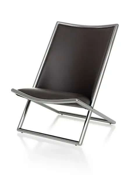 Ward Bennett took inspiration for the Scissor chair from the hammock-style chaise transatlantique of the mid-nineteenth century. An early version of the Scissor appeared in 1964. By 1968, Bennett had refined the design, settling on softened rectangular sections. Scissor is available in a wide array of metal and wood finishes; it can be upholstered in virtually any leather or textile.