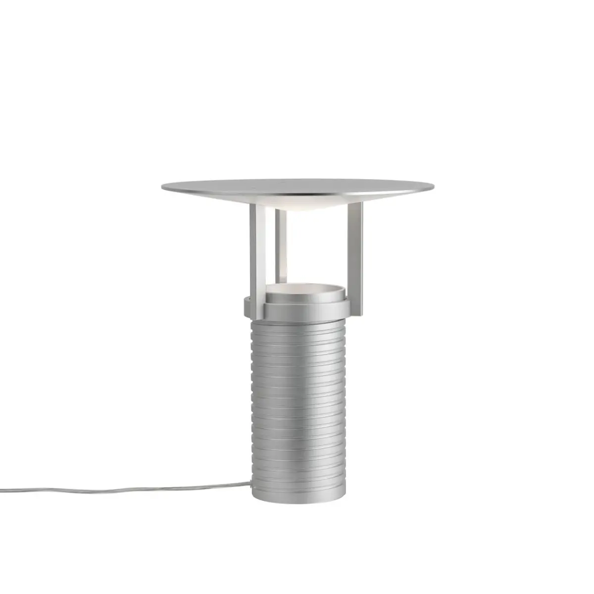With its distinctive blend of industrial and sculptural design, the Set Lamp features an upward-facing light that shines through an aluminum shade, emitting a bright yet indirect glow. The lamp’s adjustable shade height, facilitated by threads on the body, allows for a tactile rotation and enables personalized changes in angle and light intensity. This unique lamp exudes character and seamlessly blends into a variety of spaces—whether placed on the floor, windowsills, sideboards, or any preferred location—making a bold statement as a distinctive centerpiece.