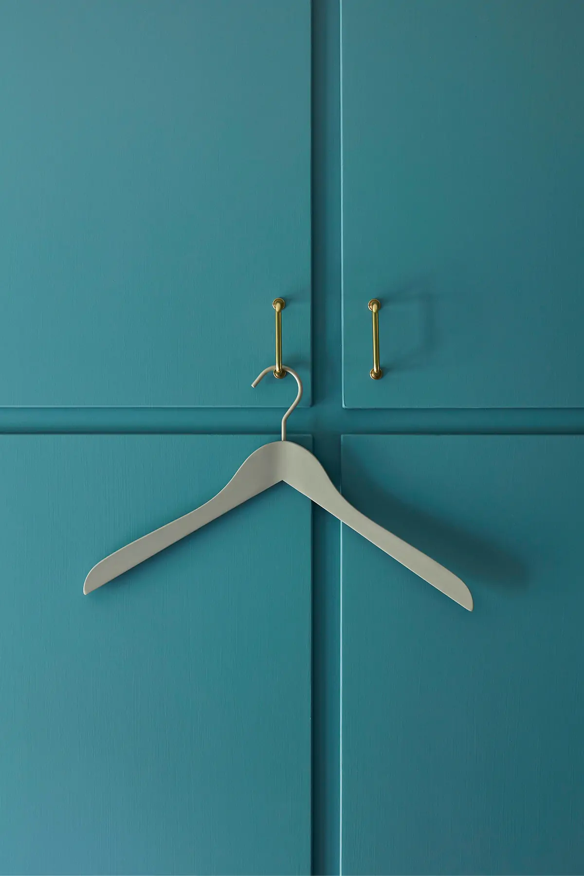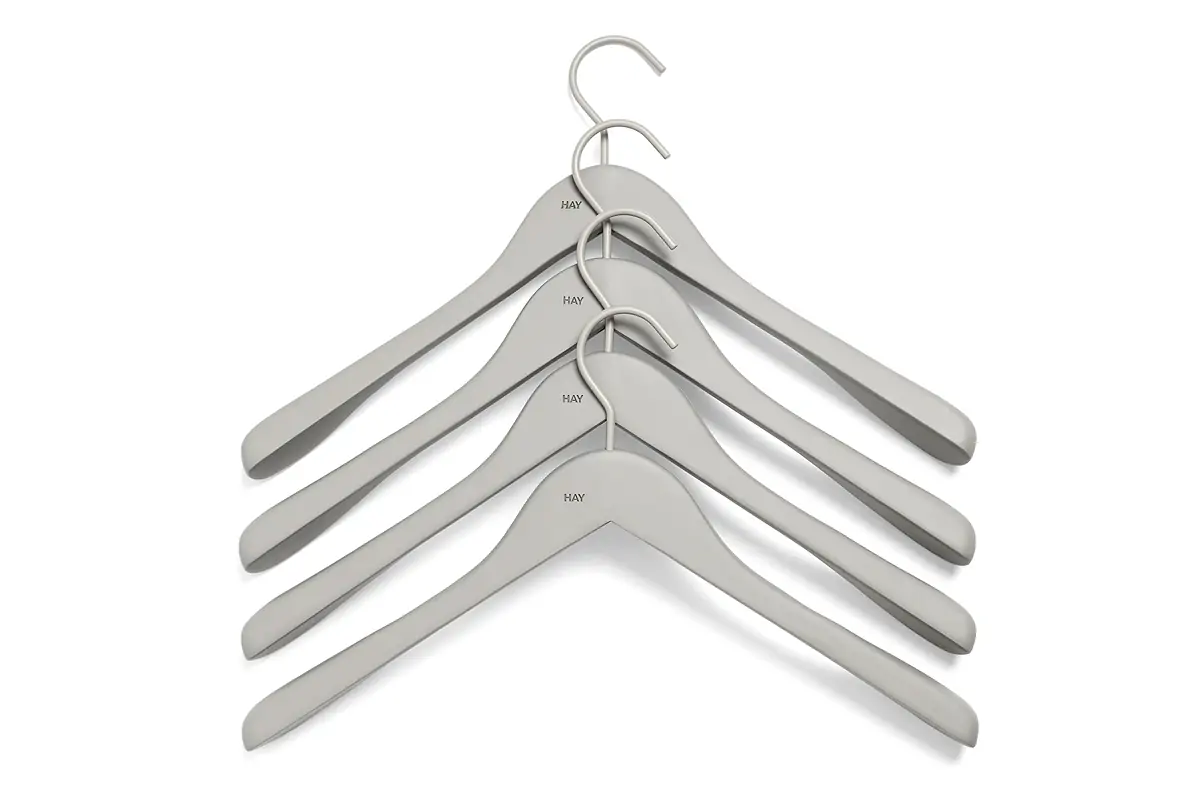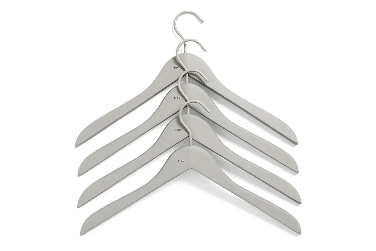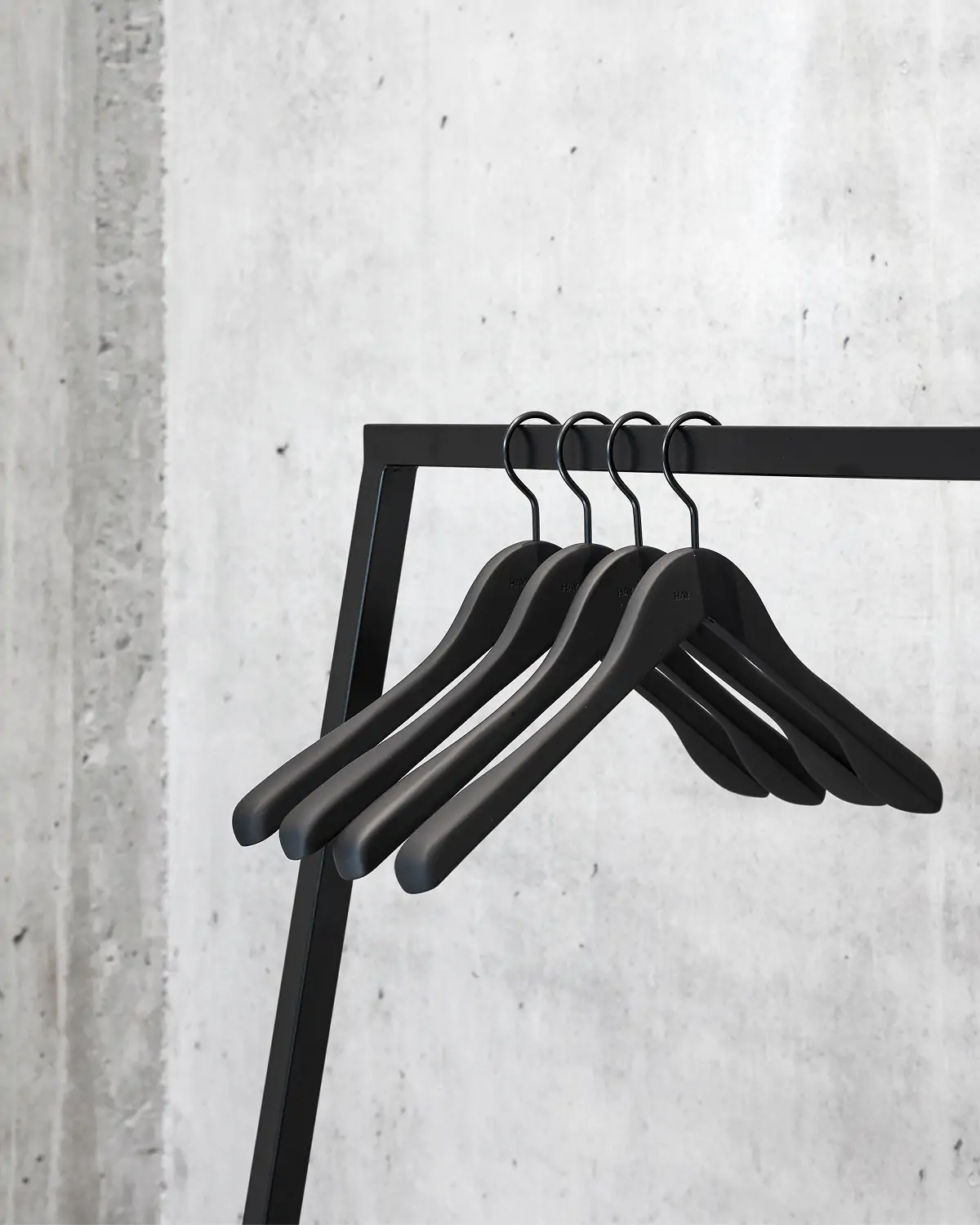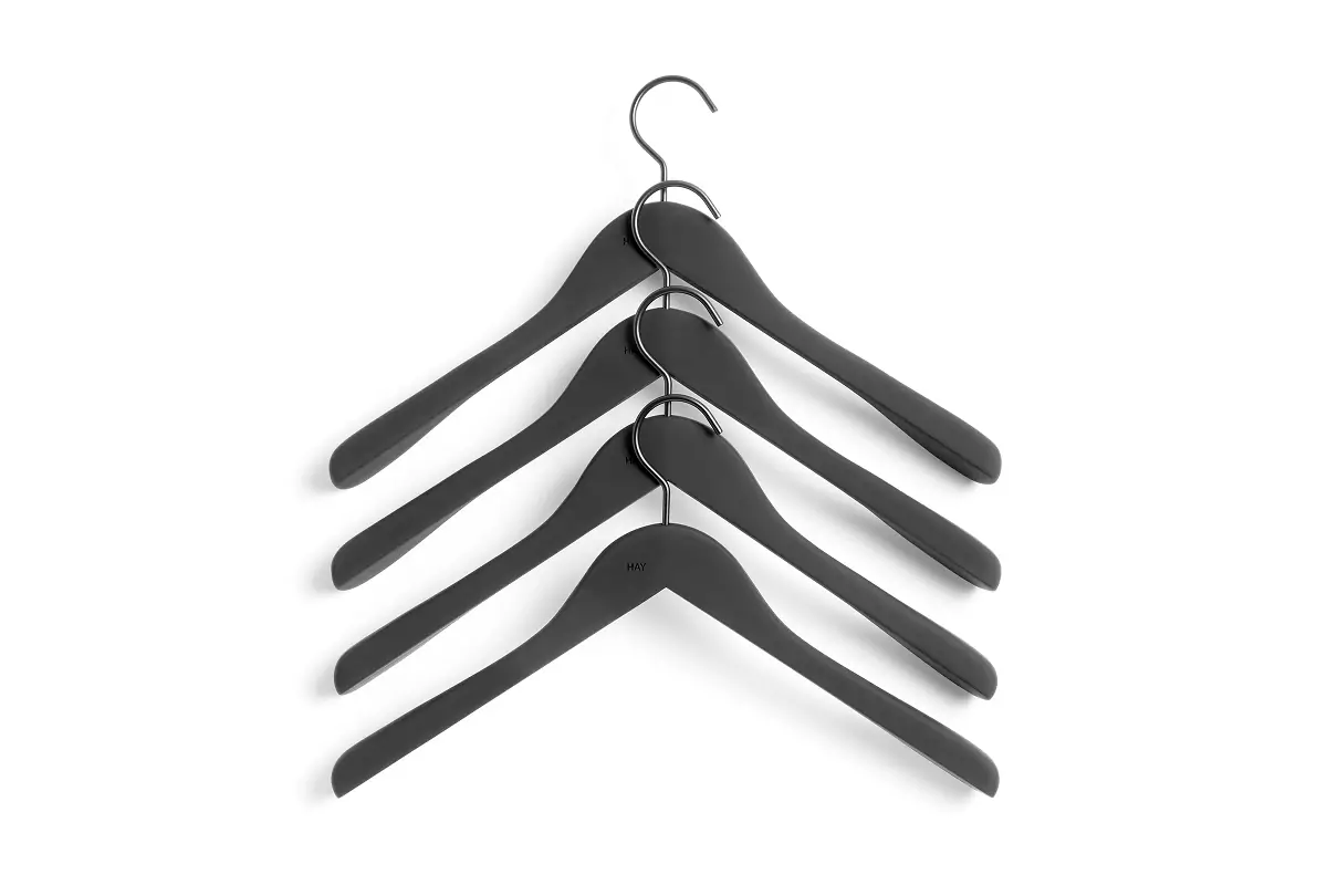 Soft is a wooden coat hanger by HAY. The black rubber coating prevents clothes from falling and keeps them in place. Perfect for jackets! The box contains four hangers.