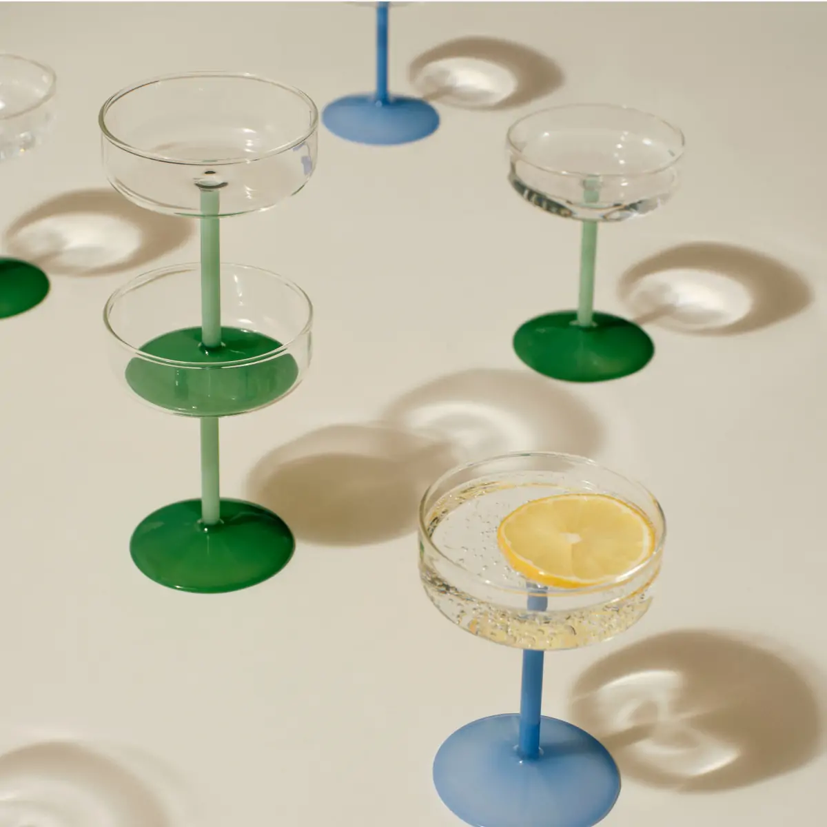 Tint Coupe Glass is a collection of elegant glasses made in tinted borosilicate glass. The classic coupe design features a long stem and shallow, broad bowl, making it suitable for serving champagne and cocktails, as well as ice cream, fruit or other desserts. The glasses come in sets of two.