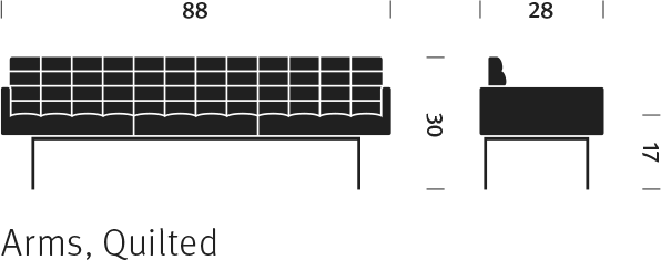 Cantilevered atop narrow steel legs that are available in a range of metal finishes, the Tuxedo Sofa cuts a low and sleek profile thanks to the horizontal band formed by the back and (optional) arms. Crisply tailored upholstery that covers the slim, dual-density foam cushions furthers the design’s lightweight appearance. Each piece is available in a full range of upholstery with or without quilting.
