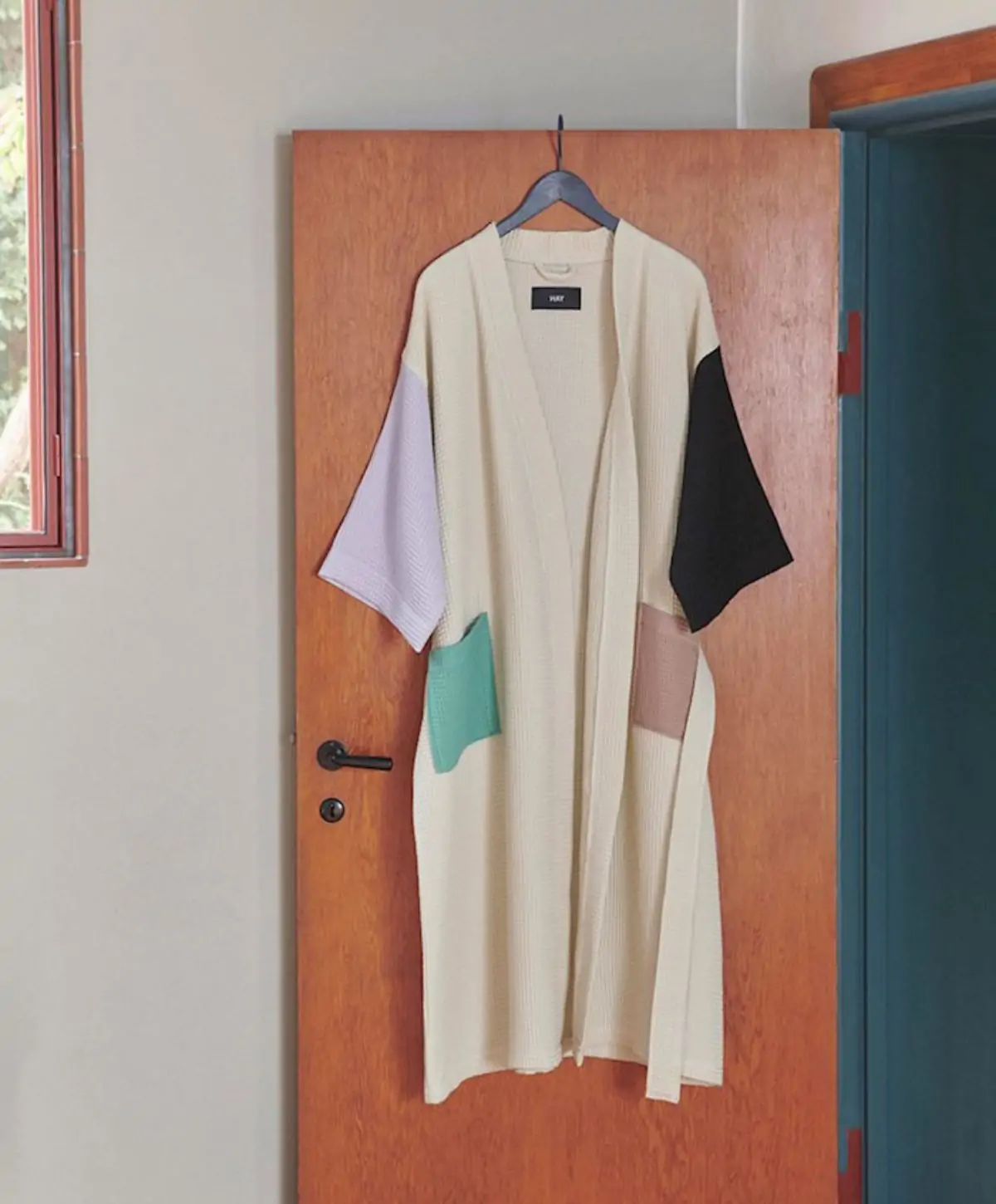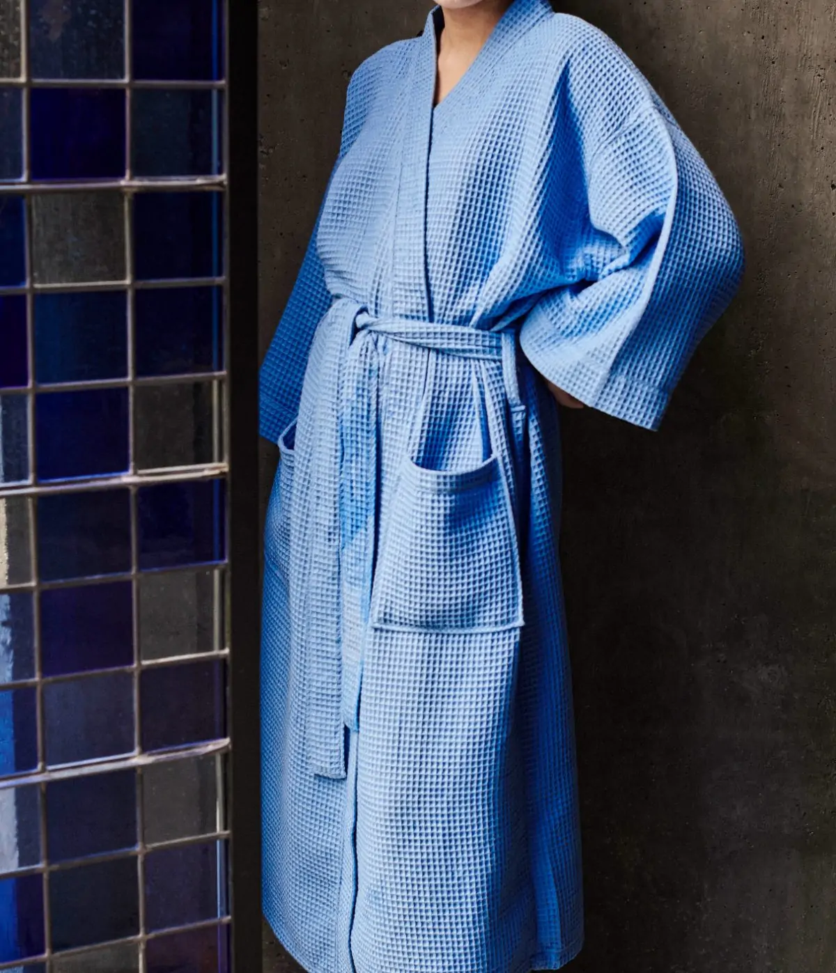 The Waffle Bathrobe is a series of versatile bathrobes in a soft and durable cotton-blend with a distinctive three-dimensional waffle texture. Featuring a relaxed shape, pockets and matching tie belt, it is a stylish and functional design that can be used around the house, on the beach or by the pool. Available in different colour options.