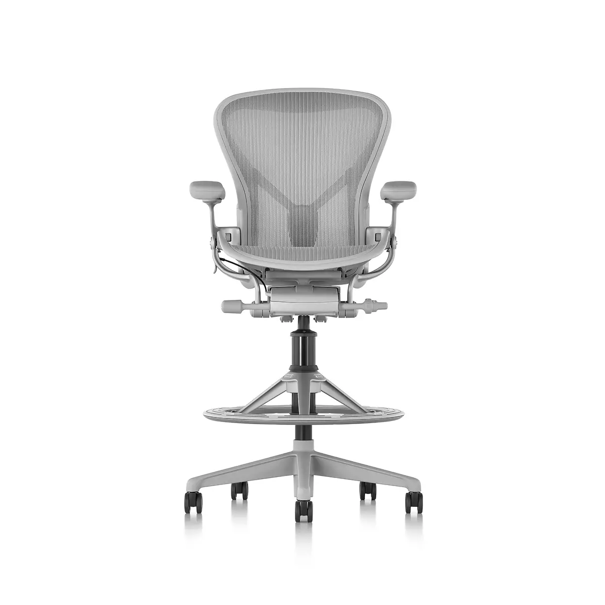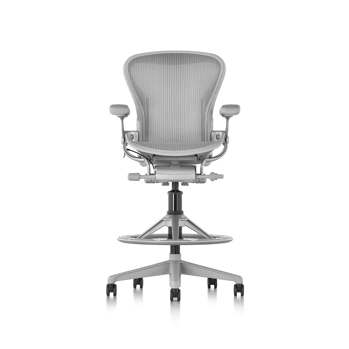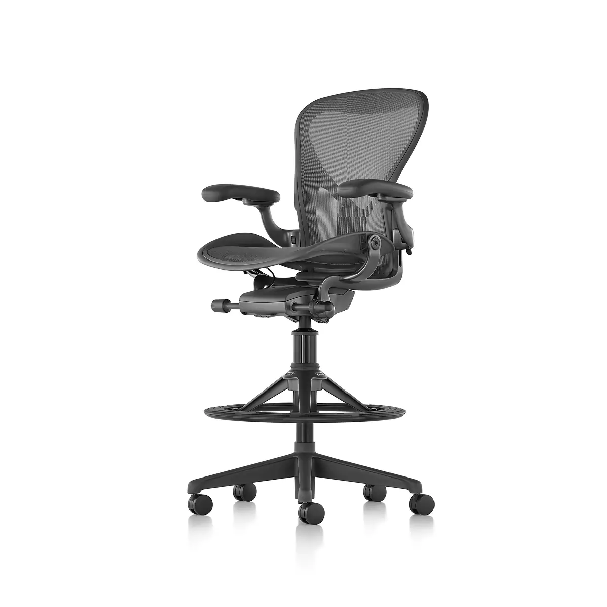 Designers Bill Stumpf and Don Chadwick kept innovation at the core of the Aeron Stool from Herman Miller. Its revolutionary ergonomic support, breathable comfort, and adjustable arms, seat height, depth, and recline make it effortless for everyone to benefit from optimal seating posture. Aeron’s 8Z Pellicle suspension material features eight separate zones of tension to quietly support your body’s pressure points for all-day ergonomic support and comfort while working on higher work surfaces and tabletops. The footrest platform is three times wider than the typical footring and was designed to provide a comfortable area to support your feet that also moves when you adjust your seat. Made in part from recycled ocean-bound plastic, it’s an eco-friendly choice, too.