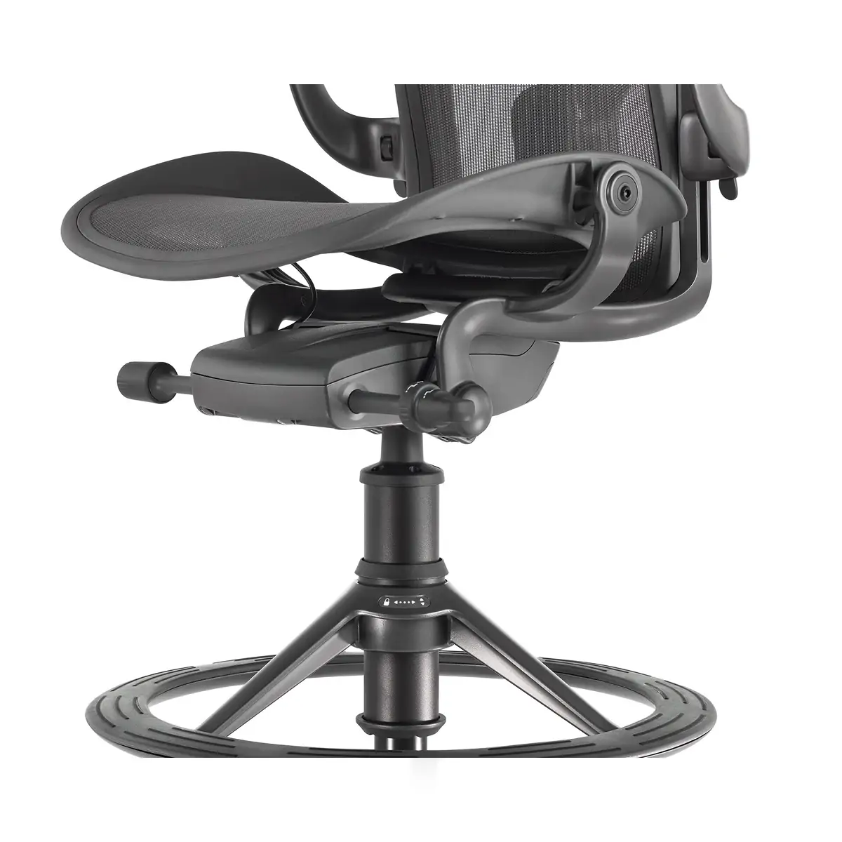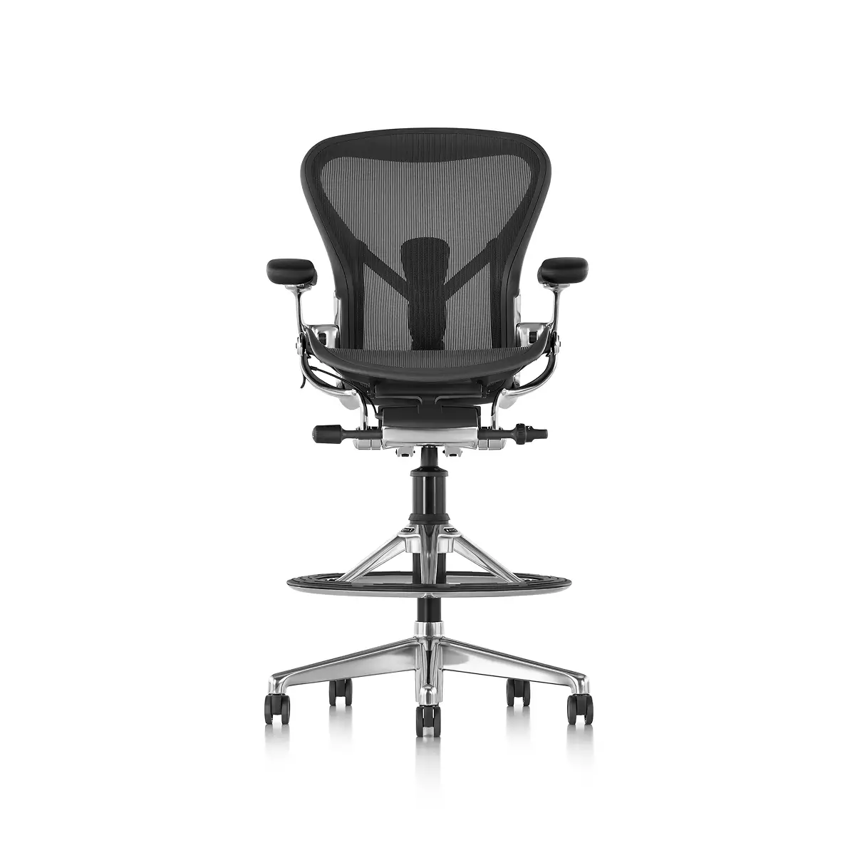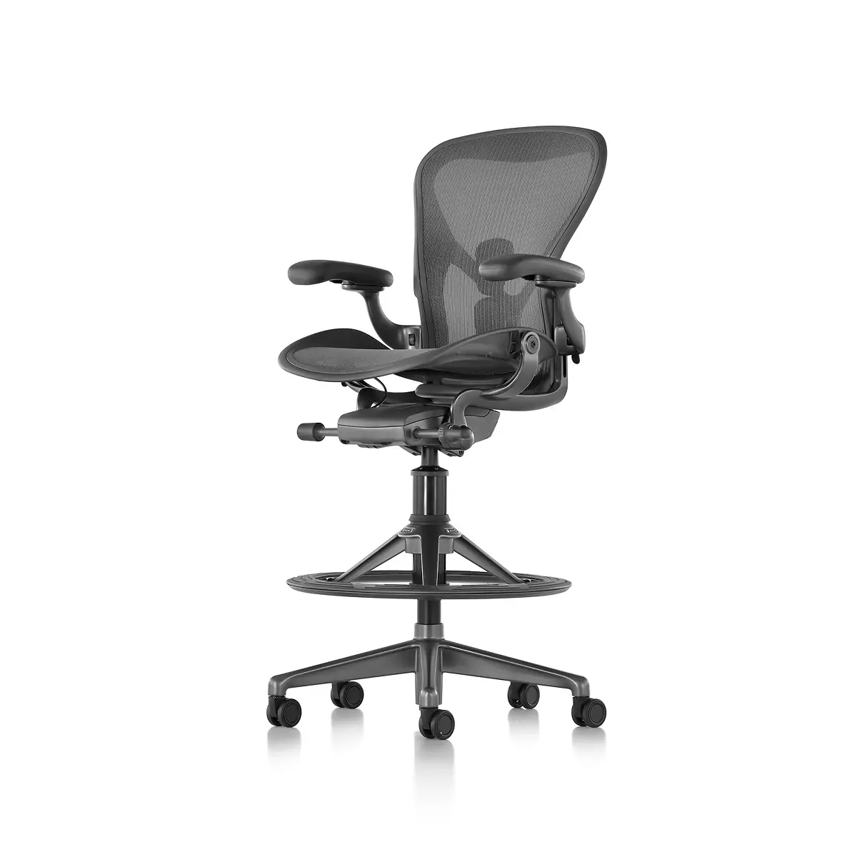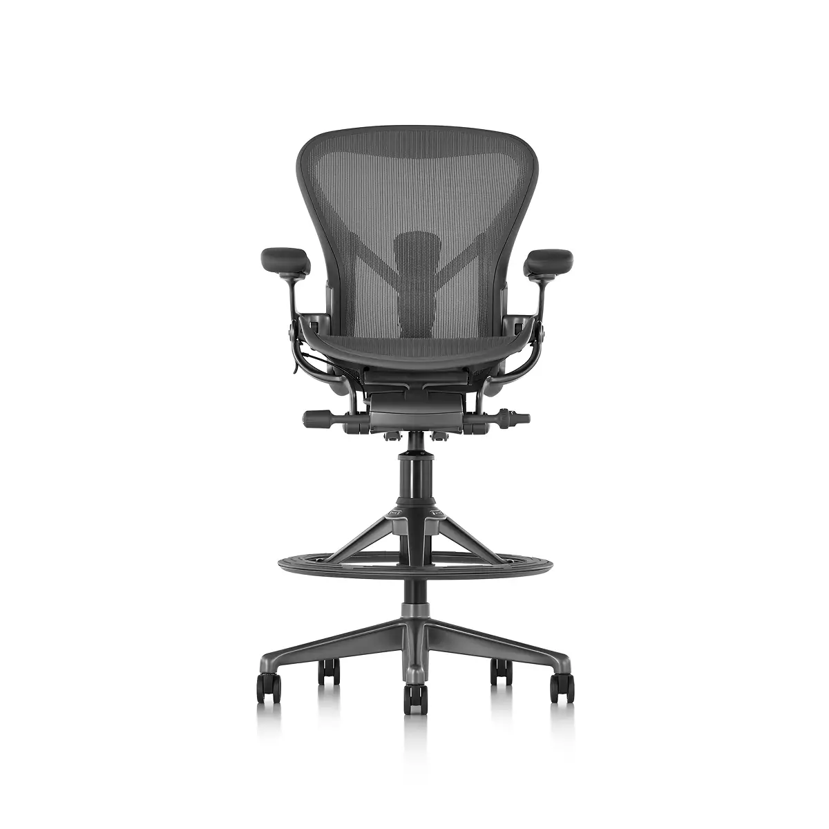 Designers Bill Stumpf and Don Chadwick kept innovation at the core of the Aeron Stool from Herman Miller. Its revolutionary ergonomic support, breathable comfort, and adjustable arms, seat height, depth, and recline make it effortless for everyone to benefit from optimal seating posture. Aeron’s 8Z Pellicle suspension material features eight separate zones of tension to quietly support your body’s pressure points for all-day ergonomic support and comfort while working on higher work surfaces and tabletops. The footrest platform is three times wider than the typical footring and was designed to provide a comfortable area to support your feet that also moves when you adjust your seat. Made in part from recycled ocean-bound plastic, it’s an eco-friendly choice, too.