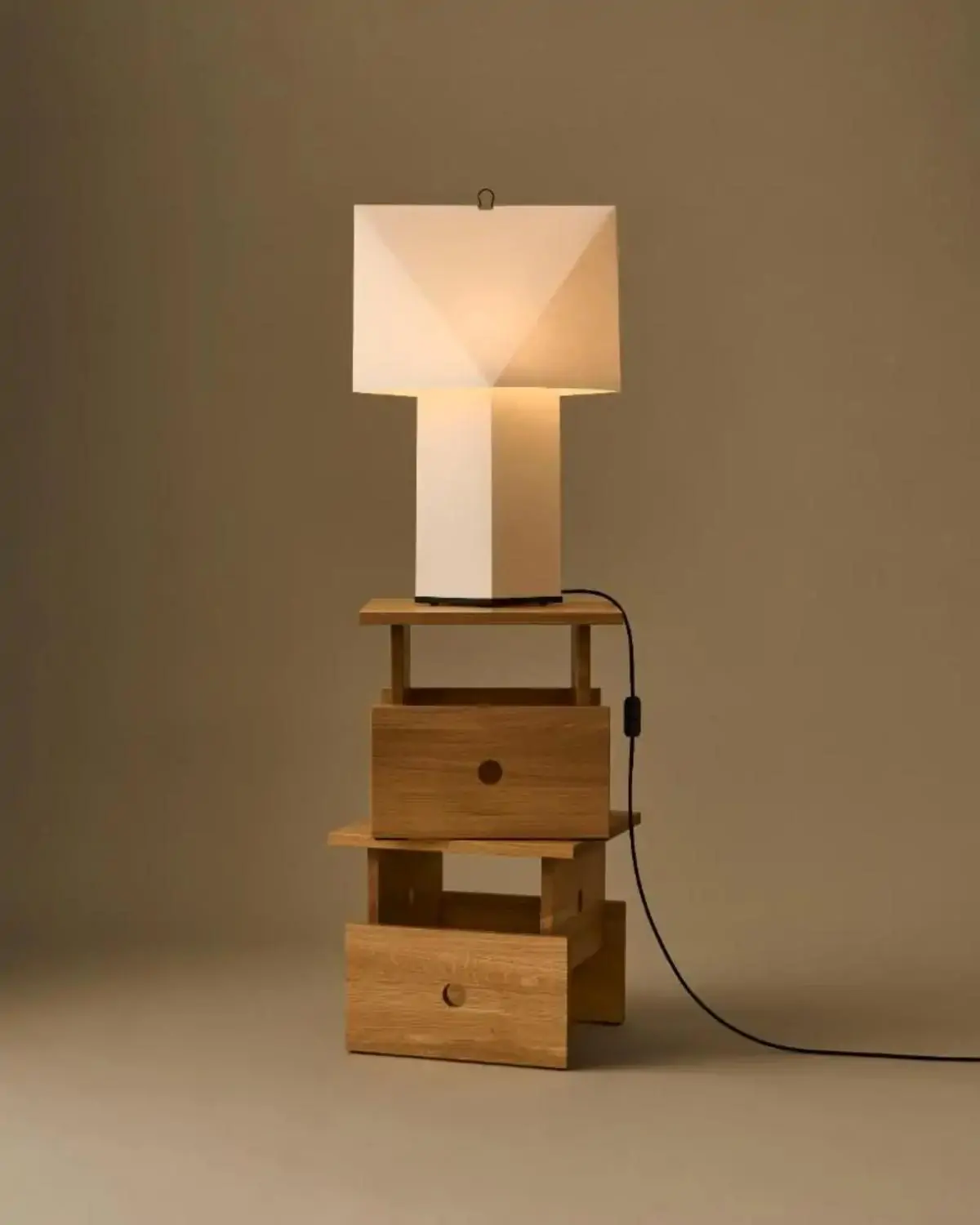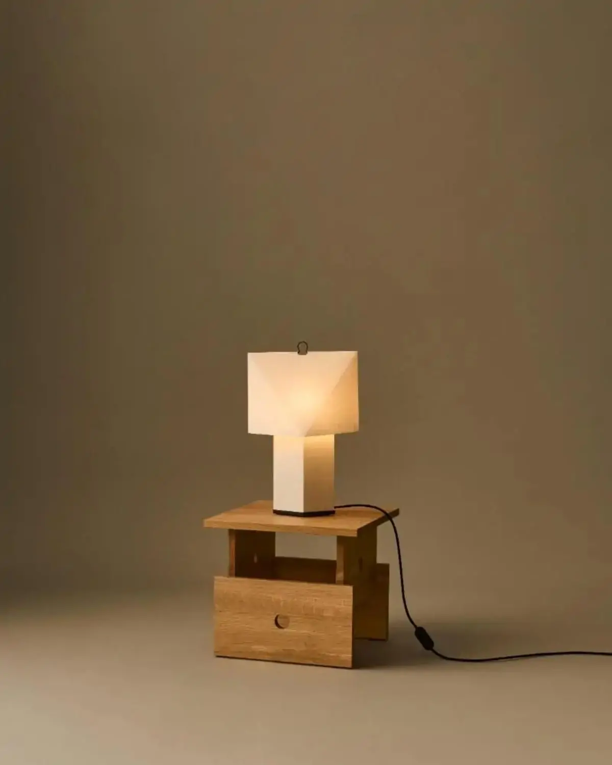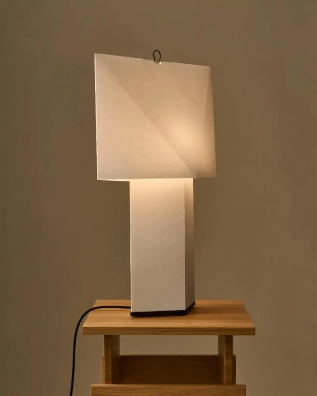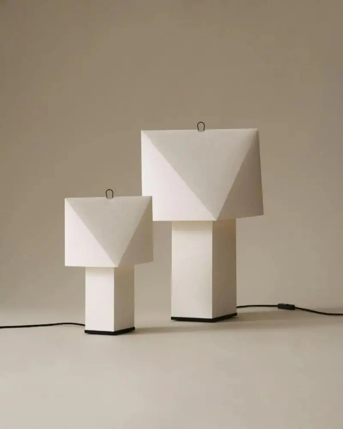 Designed by the French design duo CPRV, Aplat Table Lamp is a lightweight, sculptural lamp crafted primarily from folded paper. Its flat-packed design is assembled by the user, with precise lines and angles that build volume and shape it into a simple, graphic form. The diffused paper surface emits an ambient glow reminiscent of candlelight, adding warmth and atmosphere to its surroundings. Its minimal construction, paired with a discreet metal hook, make it lightweight and easy to move wherever light is needed. Available in two sizes, it adapts easily to most spaces – placed on tables, shelves, and windowsills, or as a floor-standing lamp in any room.