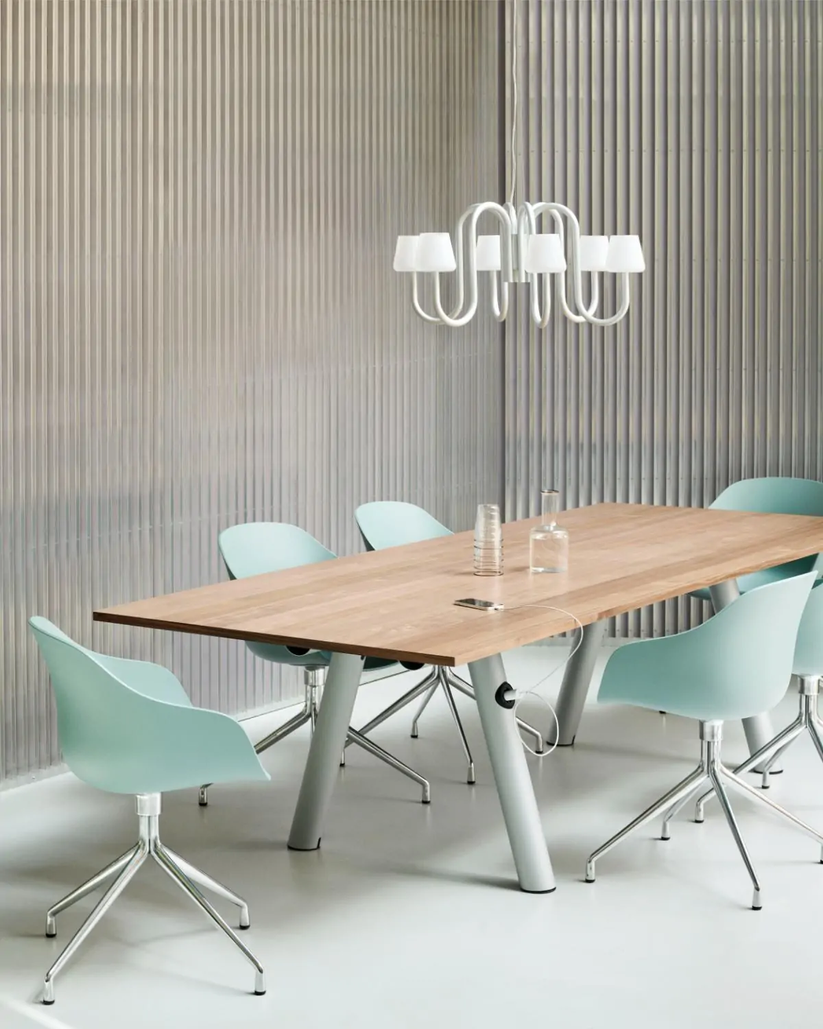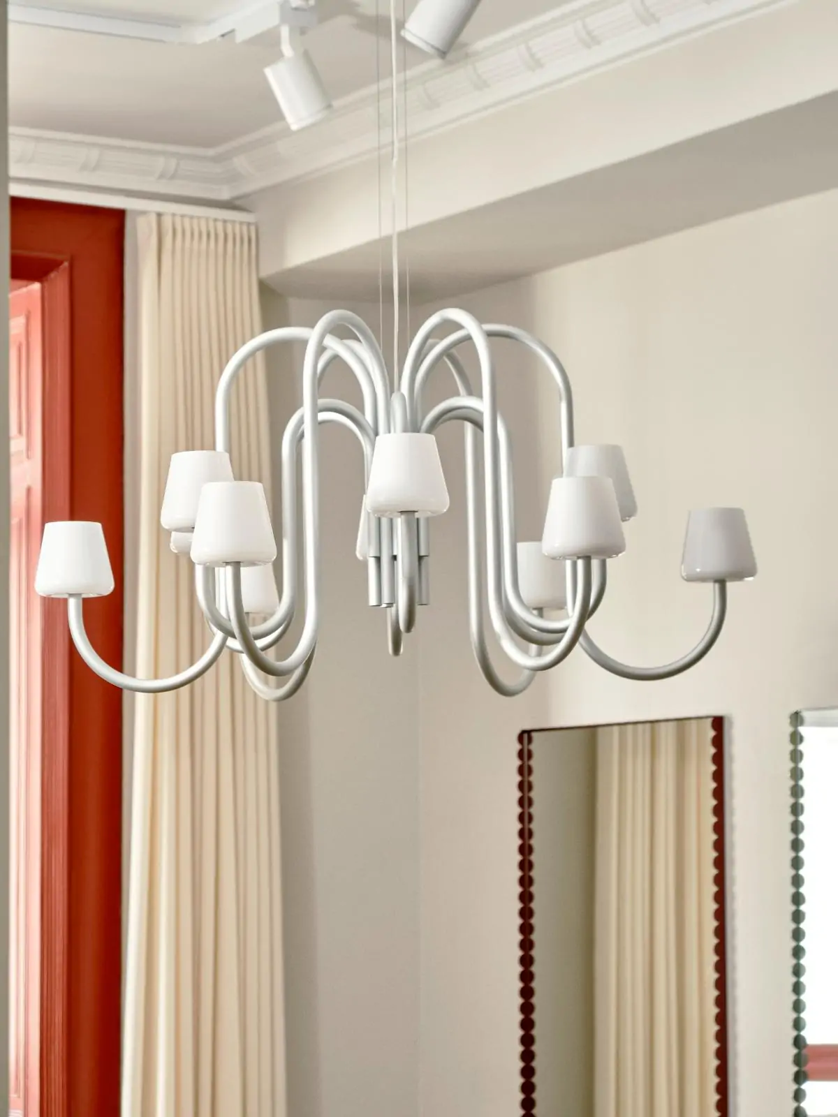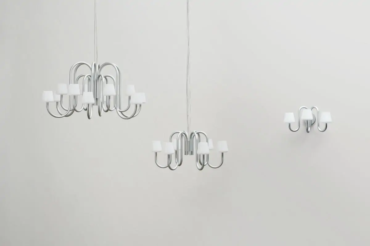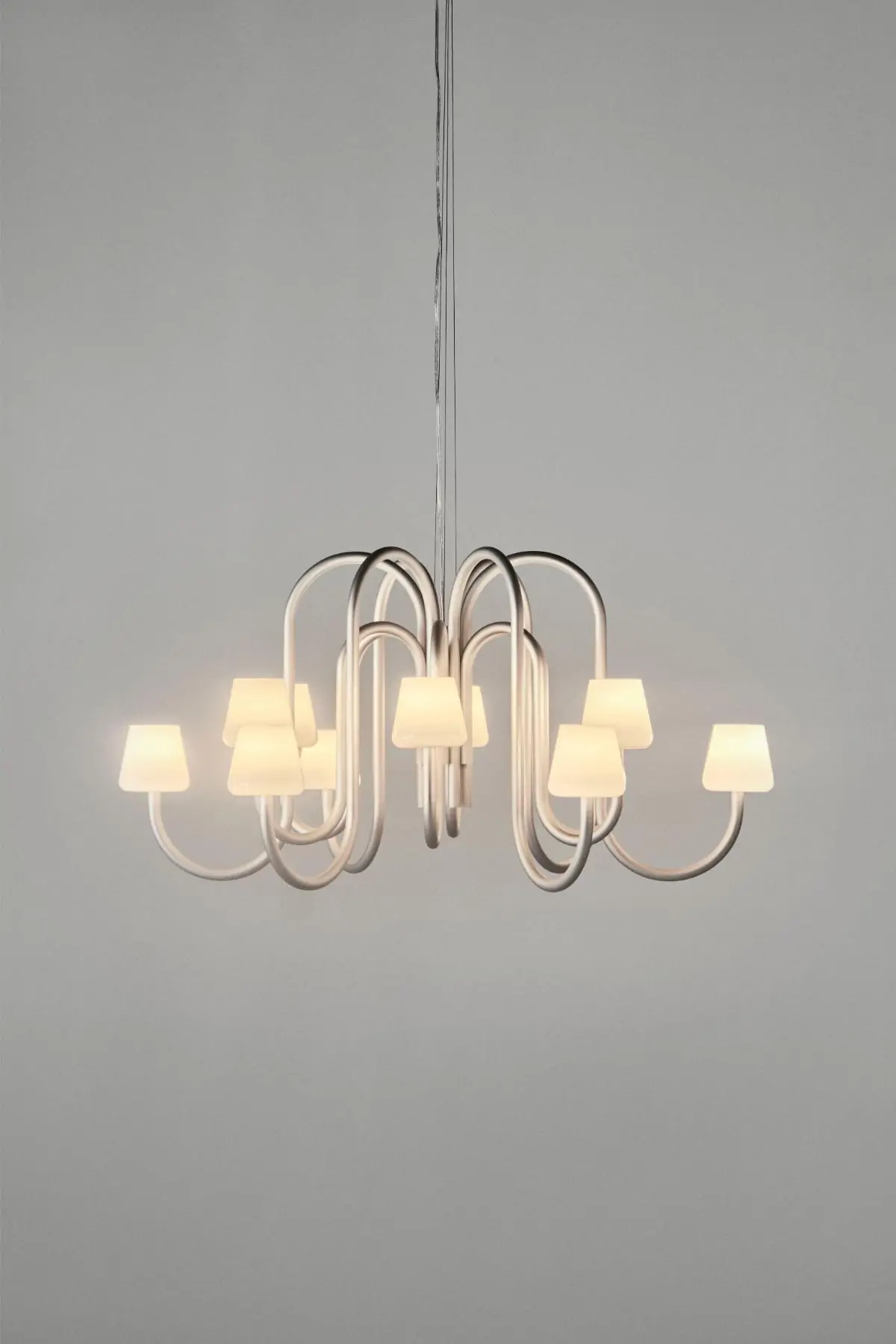 Designed by STUDIO 0405, the Apollo Chandelier is a contemporary take on a classic lamp archetype, sharing basic structural characteristics of the traditional chandelier updated in a sculptural and functional design. Comprising multiple mouth-blown opal glass shades atop curved tubular arms, creating a contrasting expression between the handcrafted, organically shaped shades and the industrial anodised aluminium tubing. The Apollo Chandelier makes an ideal room centrepiece suitable for using in a variety of private and public places. Available in two different sizes, with six or 12 arms.