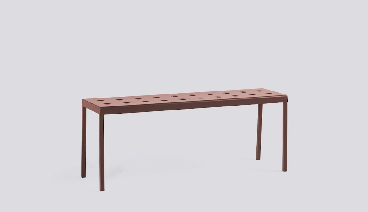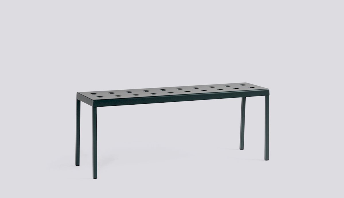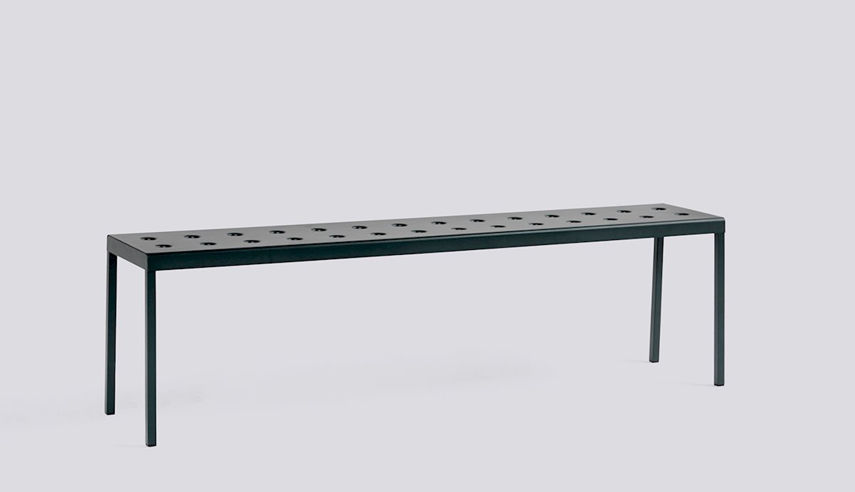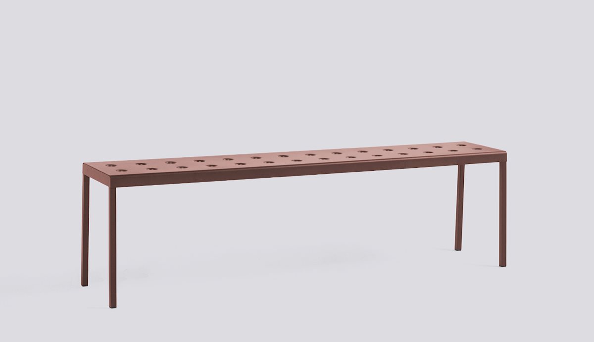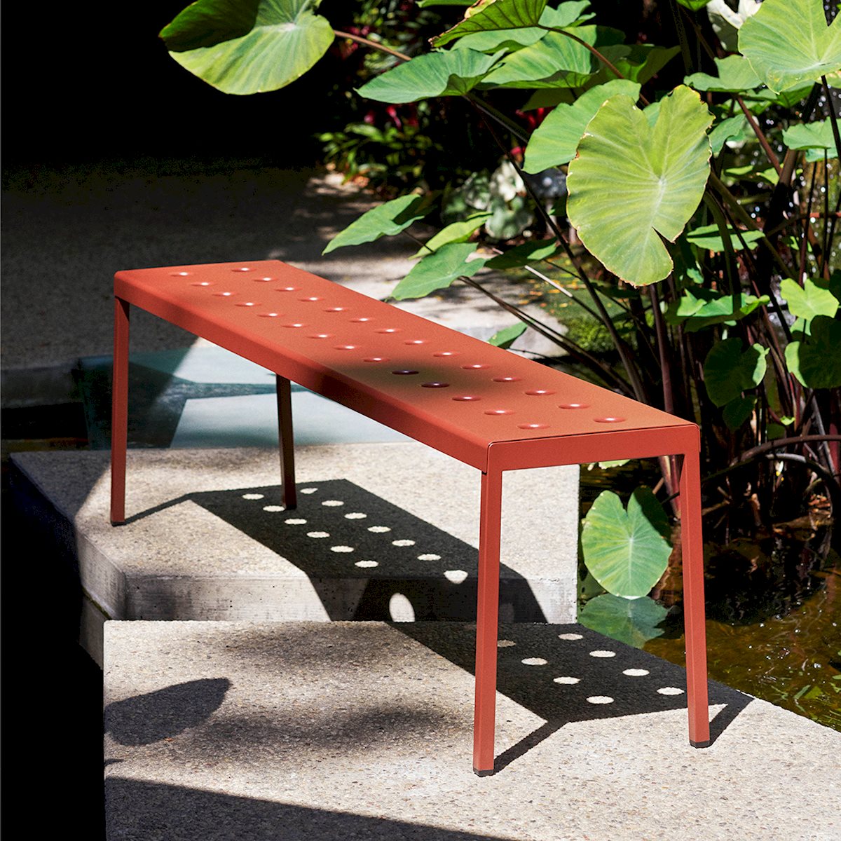 The Balcony Collection from HAY blends streamlined style with all-weather resilience. Crafted from durable powder-coated steel, the distinctive perforated design not only adds visual appeal but also ensures even weight distribution, increased durability, and water drainage for lasting support. From compact patios to spacious terraces, Balcony offers a range of hues and cushions suitable for indoor comfort in outdoor settings. The Balcony Bench features a simple rectangular design softened by the slender legs, creating a distinct expression that can be used alone or with other Balcony family products for a cohesive look.