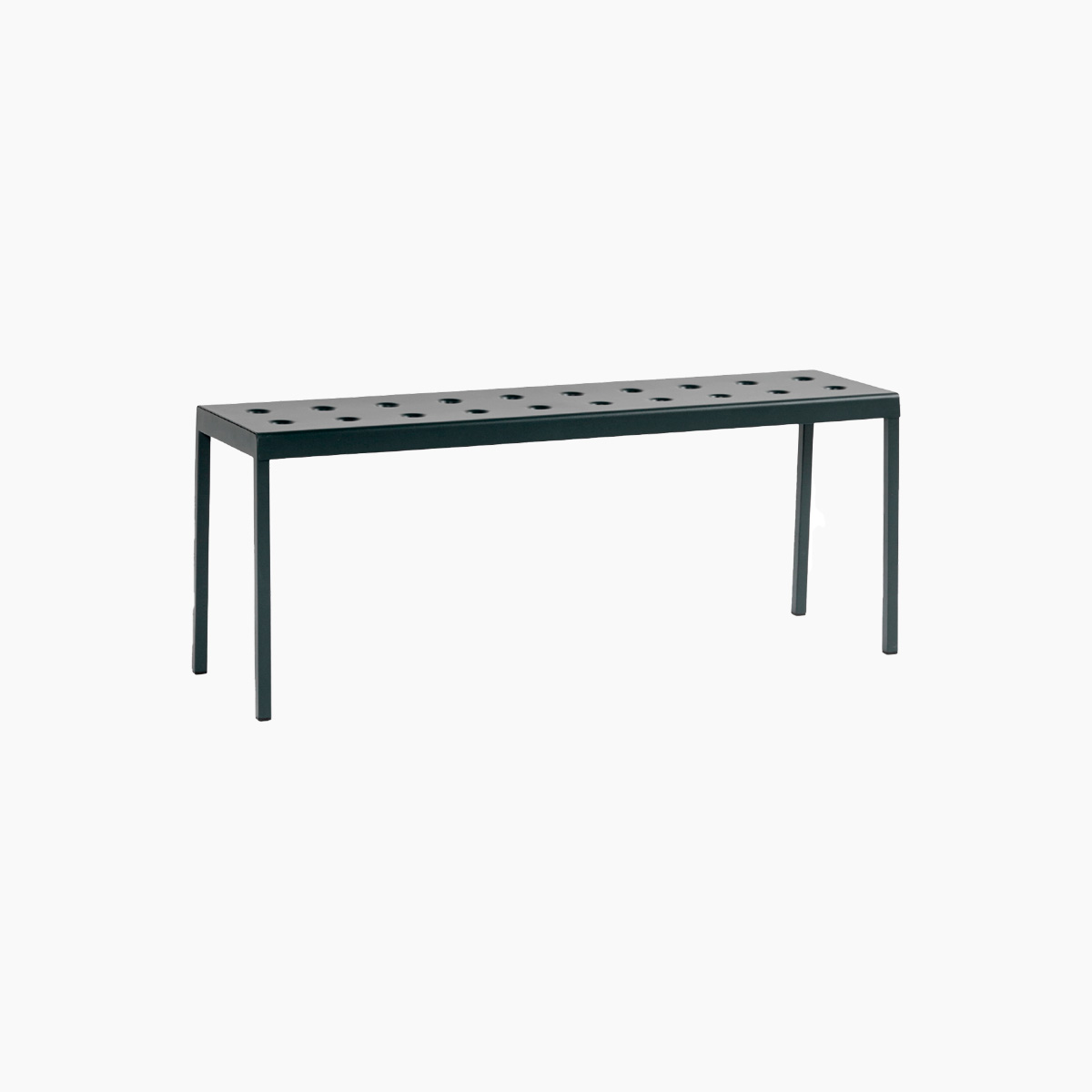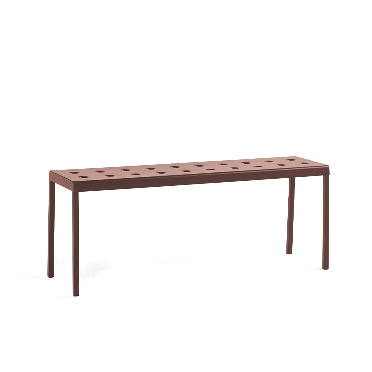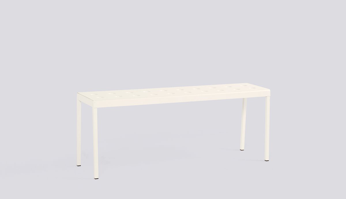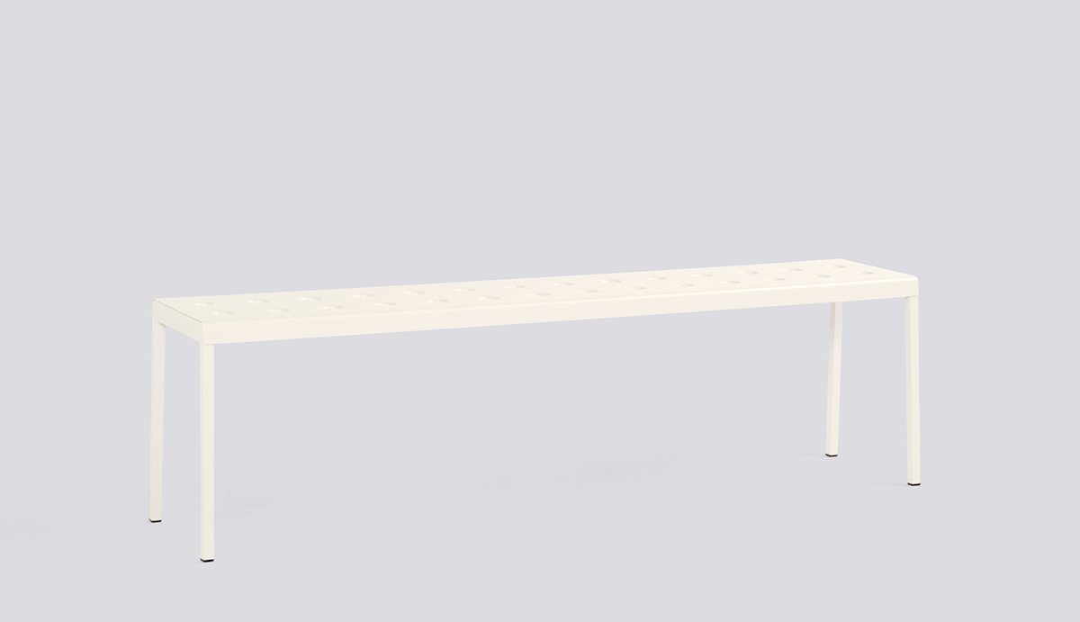 The Balcony Collection from HAY blends streamlined style with all-weather resilience. Crafted from durable powder-coated steel, the distinctive perforated design not only adds visual appeal but also ensures even weight distribution, increased durability, and water drainage for lasting support. From compact patios to spacious terraces, Balcony offers a range of hues and cushions suitable for indoor comfort in outdoor settings. The Balcony Bench features a simple rectangular design softened by the slender legs, creating a distinct expression that can be used alone or with other Balcony family products for a cohesive look.