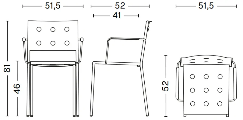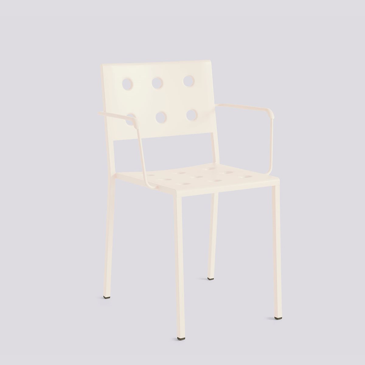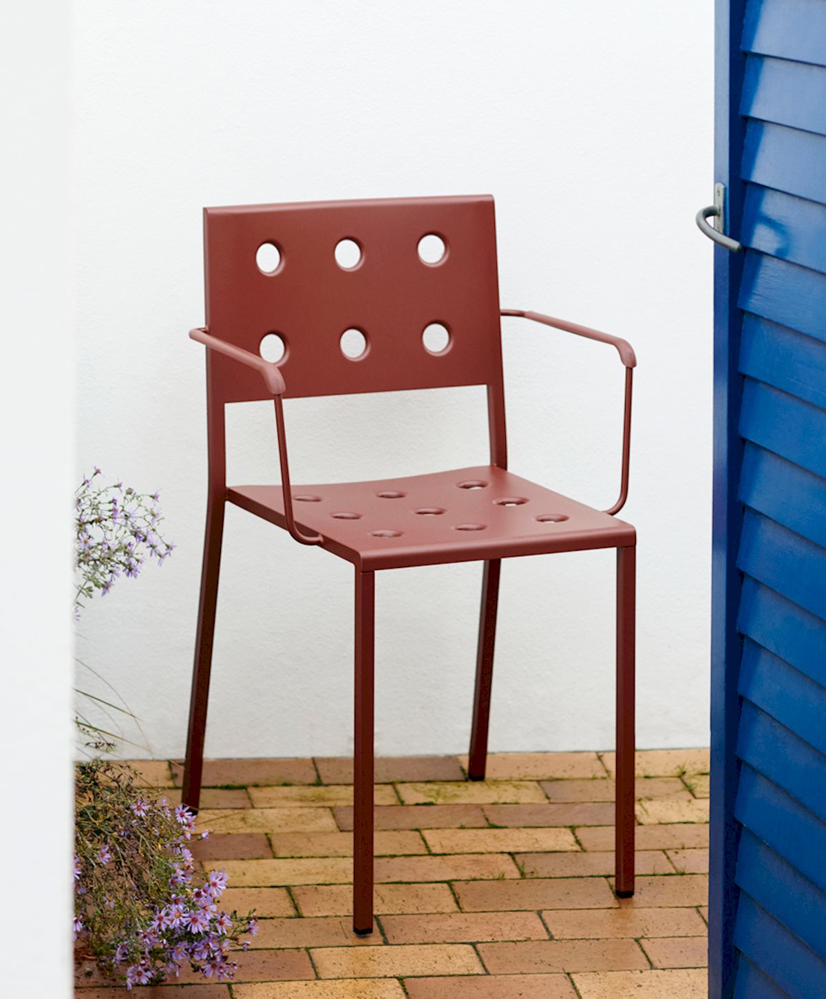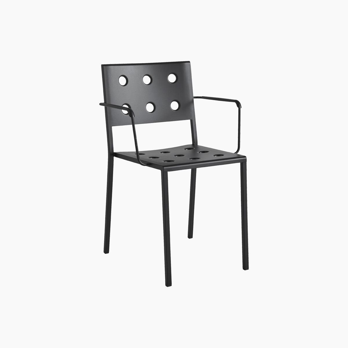 Designed for HAY by Ronan and Erwan Bouroullec, the Balcony Dining Chair is an elegant and functional dining chair for outdoor use. The square design is softened by the wide, rounded back, with the multiple holes in the seat and back strengthening the construction, as well as creating a distinct expression. Made in powder-coated steel with an outdoor primer for optimal resilience and durability, the Balcony Dining Chair is offered in a number of different colour options. The chair’s stackable design means it is well suited to all kinds of spaces, from small balconies and terraces to gardens and other larger outside areas. This chair is also available in a model with supportive armrests – the Balcony Dining Armchair.