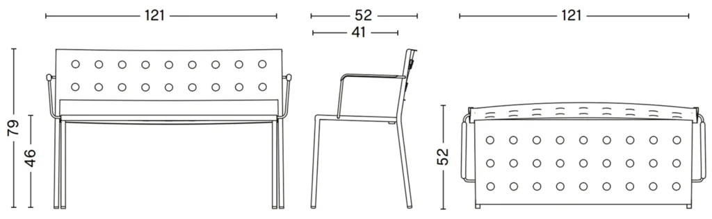 Designed for HAY by Ronan and Erwan Bouroullec, the Balcony Dining Bench is an elegant and compact seating solution for outdoor use. The simple rectangular design is softened by the slender legs, with the multiple holes in the seat and back strengthening the construction, as well as creating a distinct expression. Made in powder-coated steel with an outdoor primer for optimal resilience and durability, the Balcony Dining Bench is available with and without armrests in a number of different colour options, making it a versatile bench that can be used in all kinds of spaces, from small balconies and terraces to gardens and other larger outside areas.