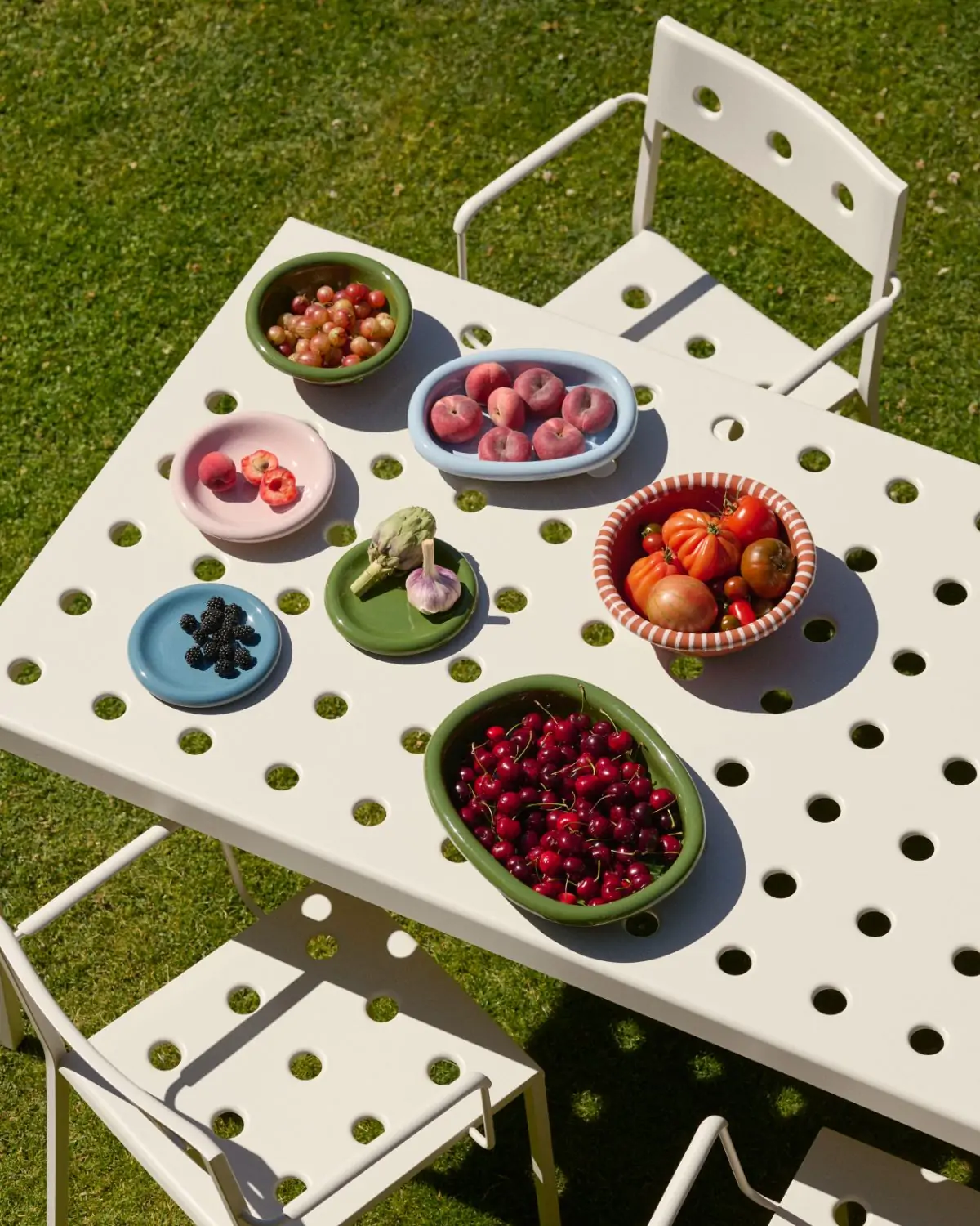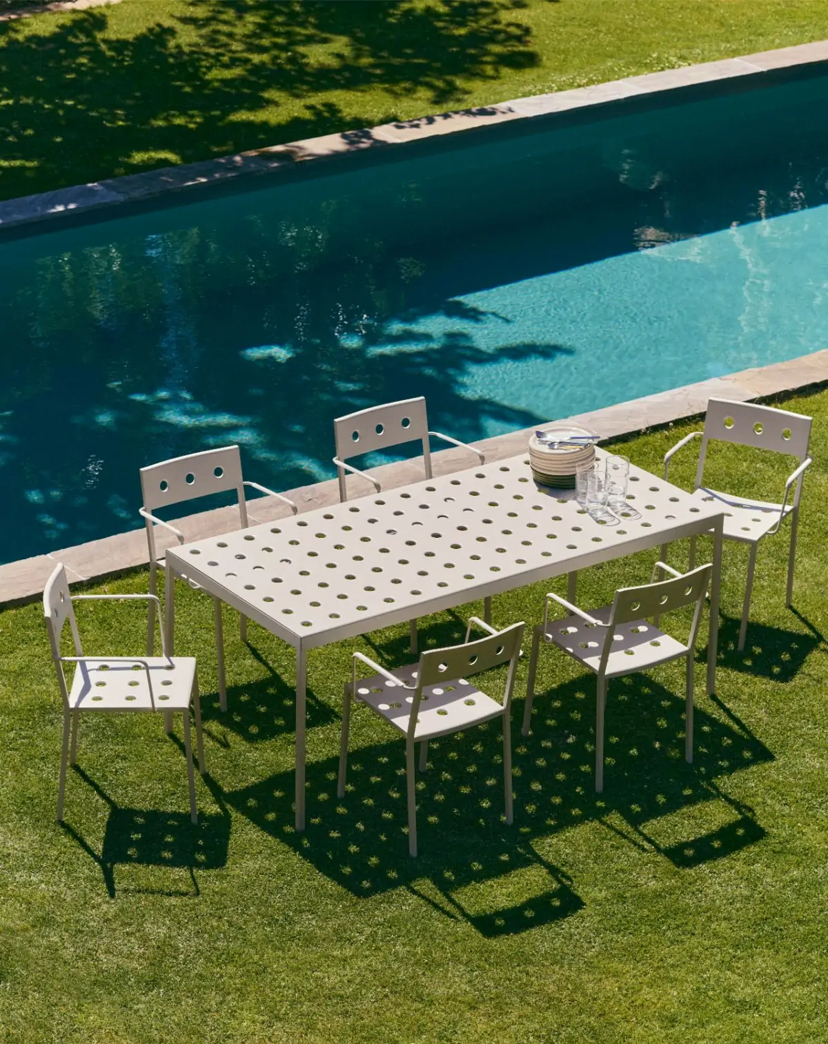 Designed for HAY by Ronan and Erwan Bouroullec, the Balcony Dining Chair is an elegant and functional dining chair for outdoor use. The square design is softened by the wide, rounded back, with the multiple holes in the seat and back strengthening the construction, as well as creating a distinct expression. Made in powder-coated steel with an outdoor primer for optimal resilience and durability, the Balcony Dining Chair is offered in a number of different colour options. The chair’s stackable design means it is well suited to all kinds of spaces, from small balconies and terraces to gardens and other larger outside areas. This chair is also available in a model with supportive armrests – the Balcony Dining Armchair.