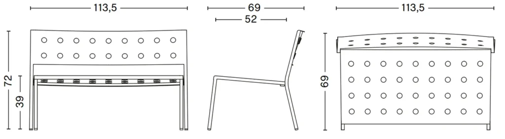 Designed for HAY by Ronan and Erwan Bouroullec, the Balcony Lounge Bench is an elegant and comfortable seating solution for outdoor use. The simple rectangular design is softened by the slender legs, with the multiple holes in the wide seat and back strengthening the construction, as well as creating a distinct expression. Made in powder-coated steel with an outdoor primer for optimal resilience and durability, the Balcony Lounge Bench is available with and without armrests in a number of different colour options, making it a versatile bench that can be used in all kinds of spaces, from terraces to gardens and other larger outside areas.