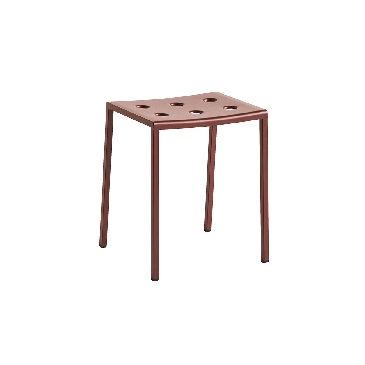The Balcony Collection from HAY blends streamlined style with all-weather resilience. Crafted from durable powder-coated steel, the distinctive perforated design not only adds visual appeal but also ensures even weight distribution, increased durability, and water drainage for lasting support. From compact patios to spacious terraces, Balcony offers a range of hues and cushions suitable for indoor comfort in outdoor settings. The stackable Balcony Stool features a rectangular design, softened by the slightly dished seat, creating a distinct expression that can be used alone or with other Balcony family products for a cohesive look.