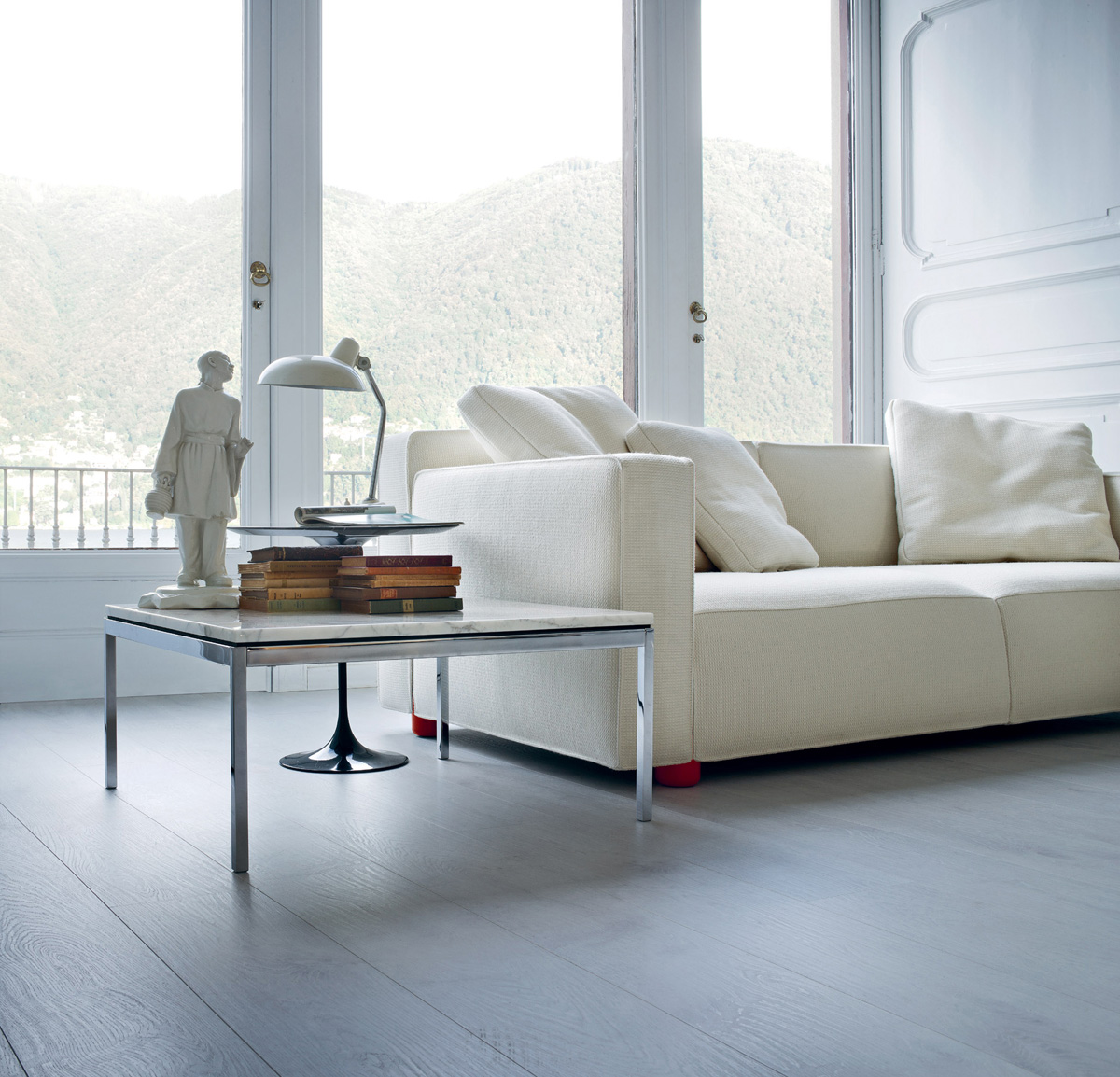 The Barber Osgerby Sofa Collection includes three sofas and two complementary ottomans. Stitched seams distinguish the pieces and reinforce their architectural profile, which is softened by the curvature of cushions on each face. The signature cast aluminum leg of the furniture can be specified in chrome and painted finishes.