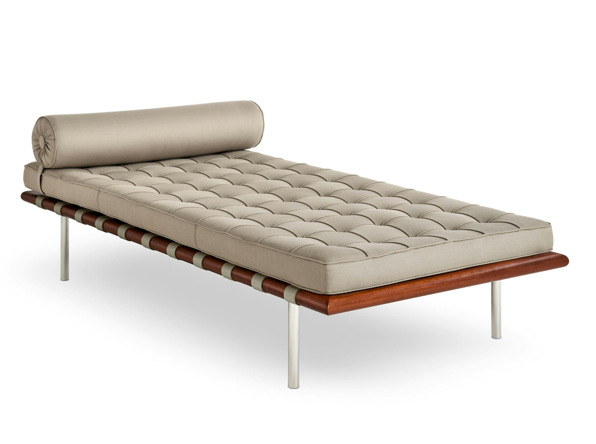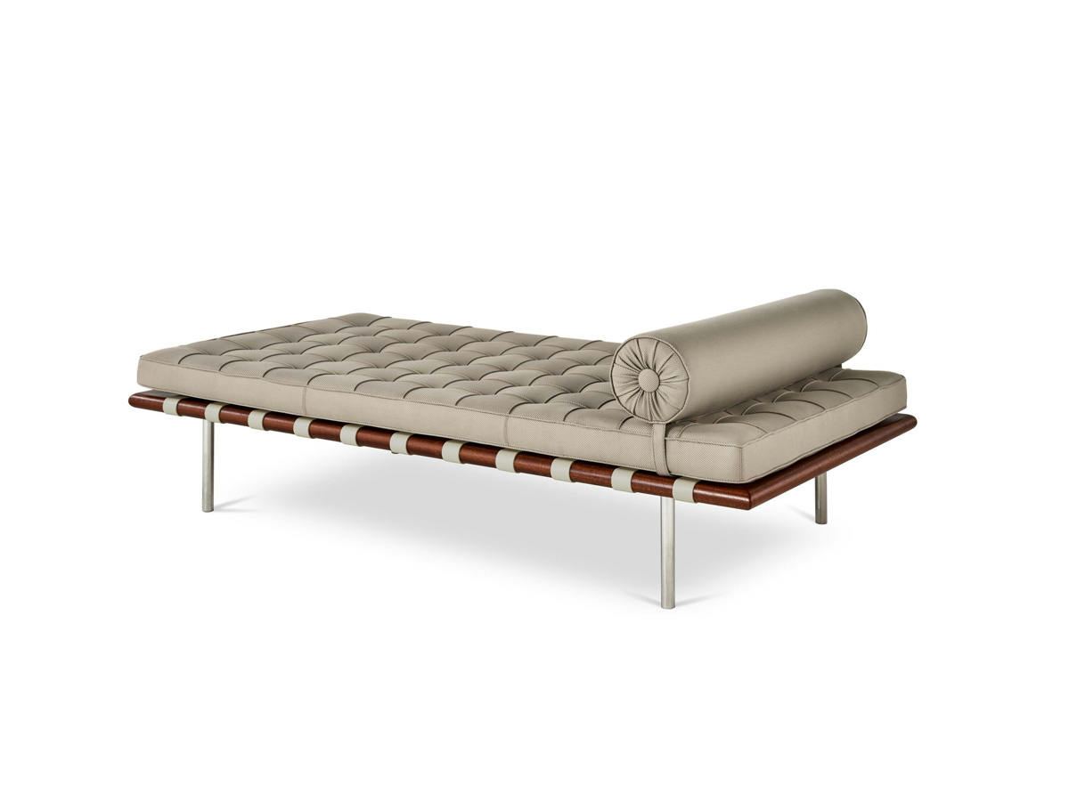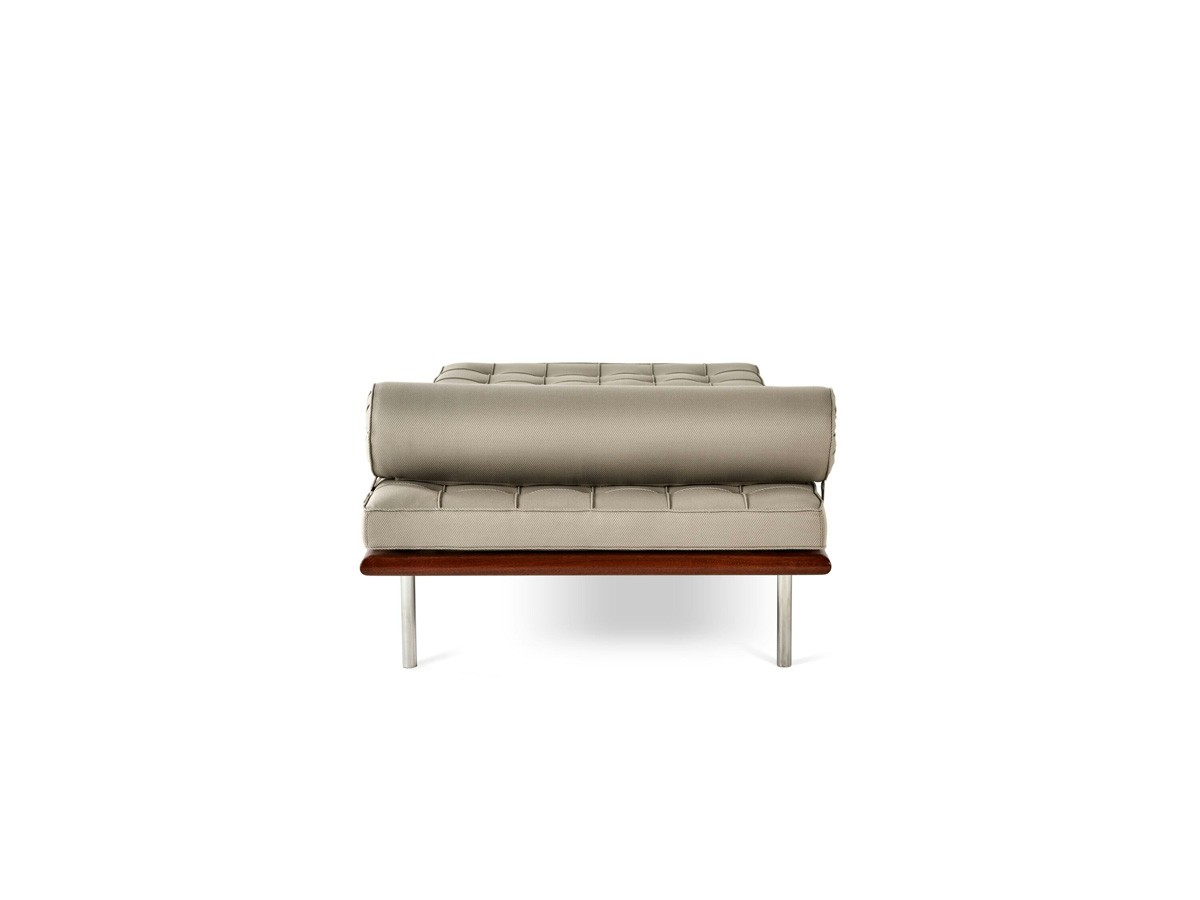 The Barcelona Couch from Knoll is a tribute to traditional craftsmanship and meticulous attention to detail. Designed by Ludwig Mies van der Rohe in 1930, this iconic daybed sofa is one of the most celebrated designs of the 20th century. It features a stainless steel and solid mahogany frame that supports a button-tufted cushioned seat. A matching bolster is secured on top to add extra cushion and comfort. The couch’s cushioning is available in a standard highly resilient urethane foam or a relaxed soft density, fire retardant urethane foam blanketed with a non-woven fabric topper.