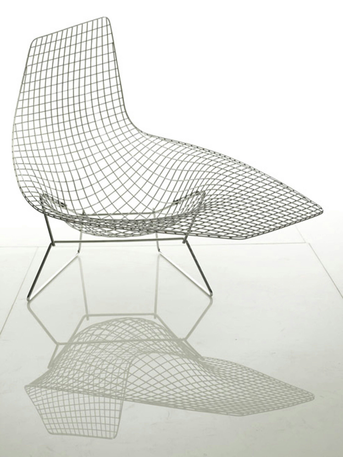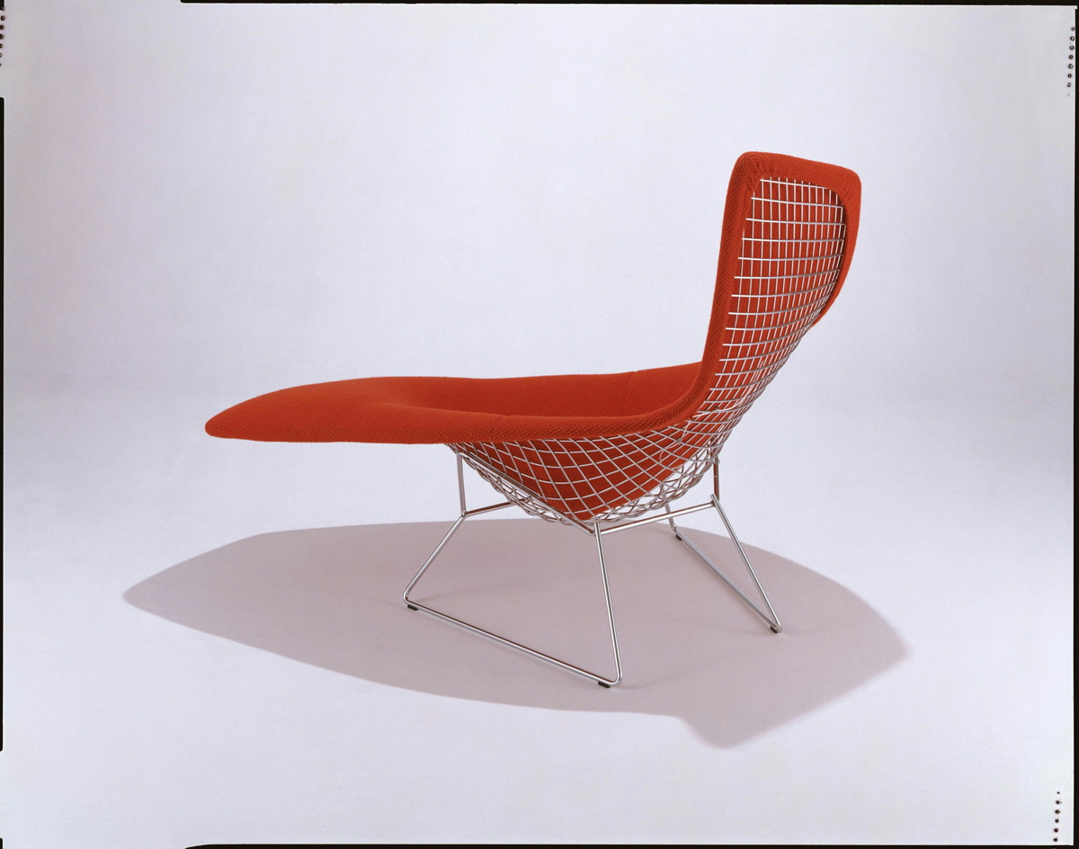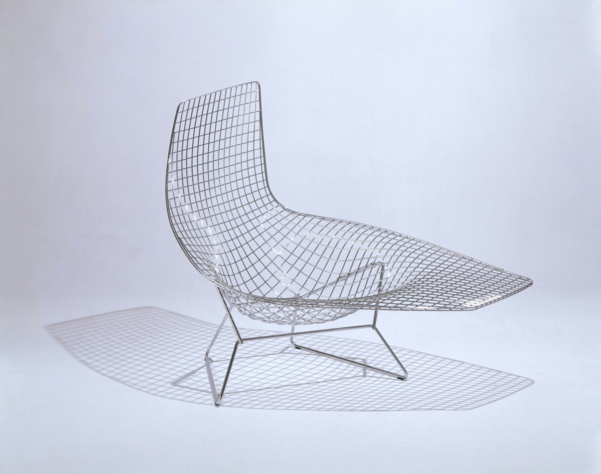 In his original presentation of wire chairs to Hans and Florence Knoll in 1950, Harry Bertoia showed a chaise longue, essentially the large diamond chair extended on two of its sides. The design was not developed at the time due to the complexity of production.
