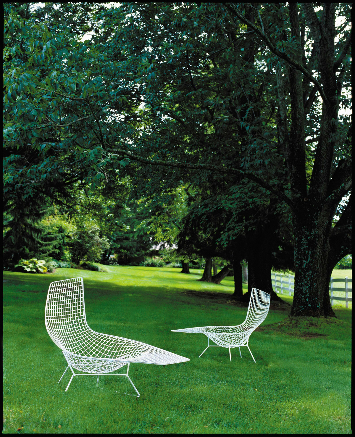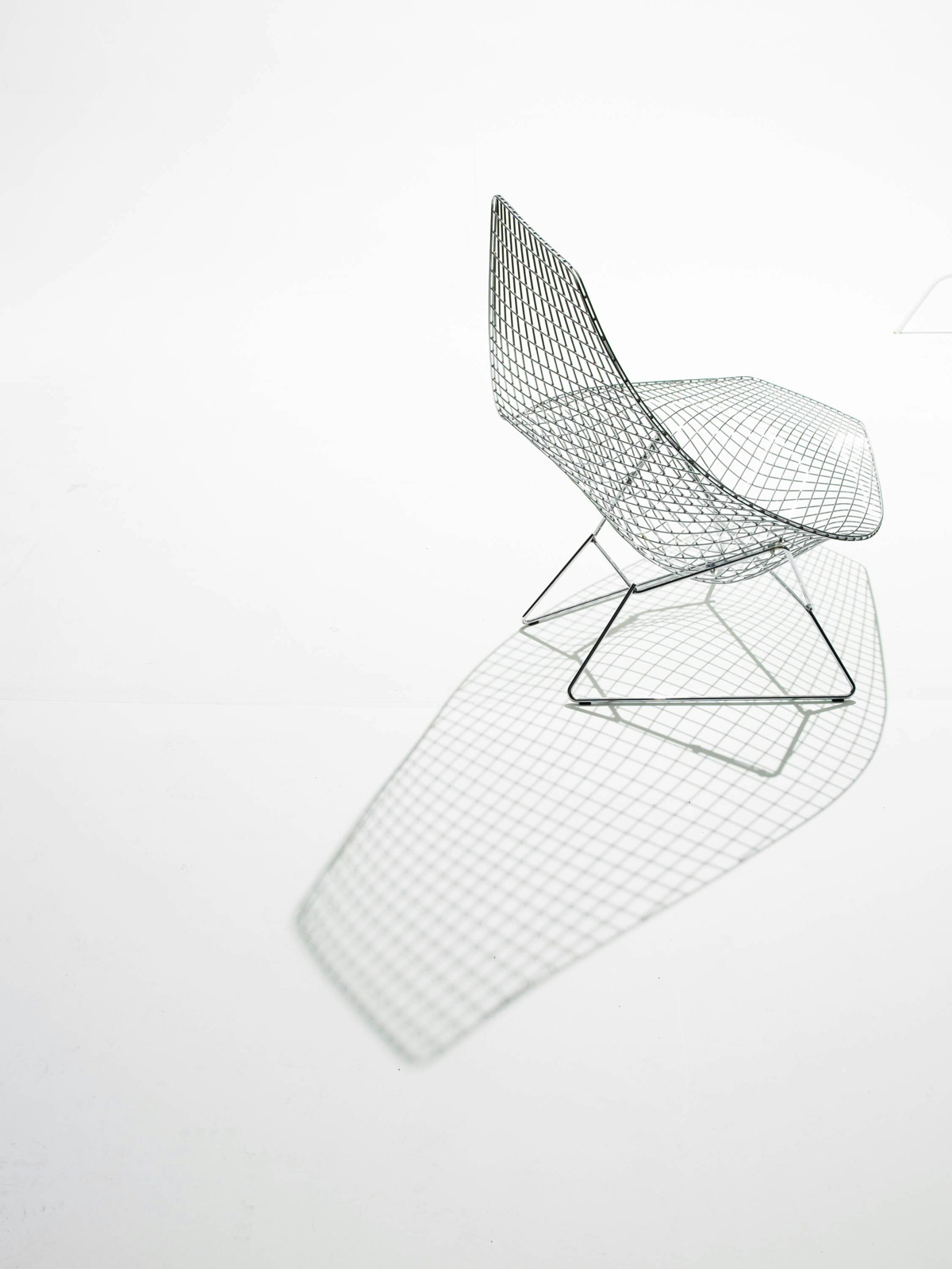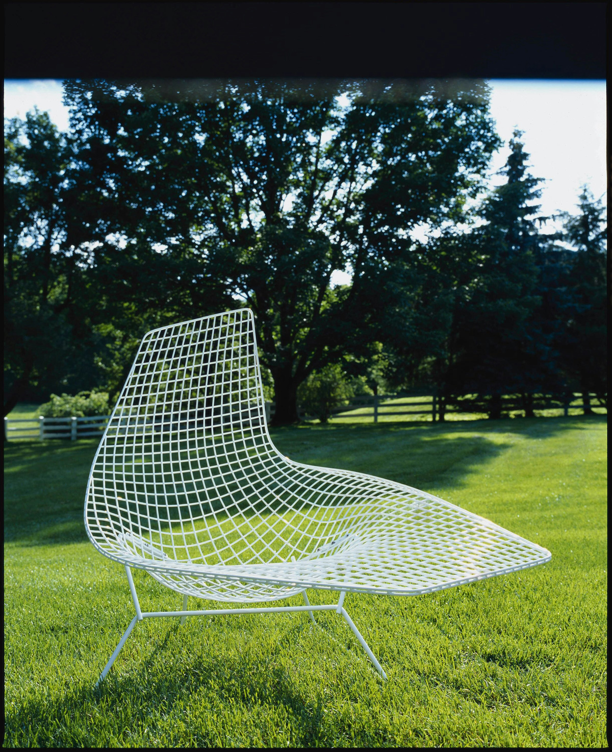 In his original presentation of wire chairs to Hans and Florence Knoll in 1950, Harry Bertoia showed a chaise longue, essentially the large diamond chair extended on two of its sides. The design was not developed at the time due to the complexity of production.