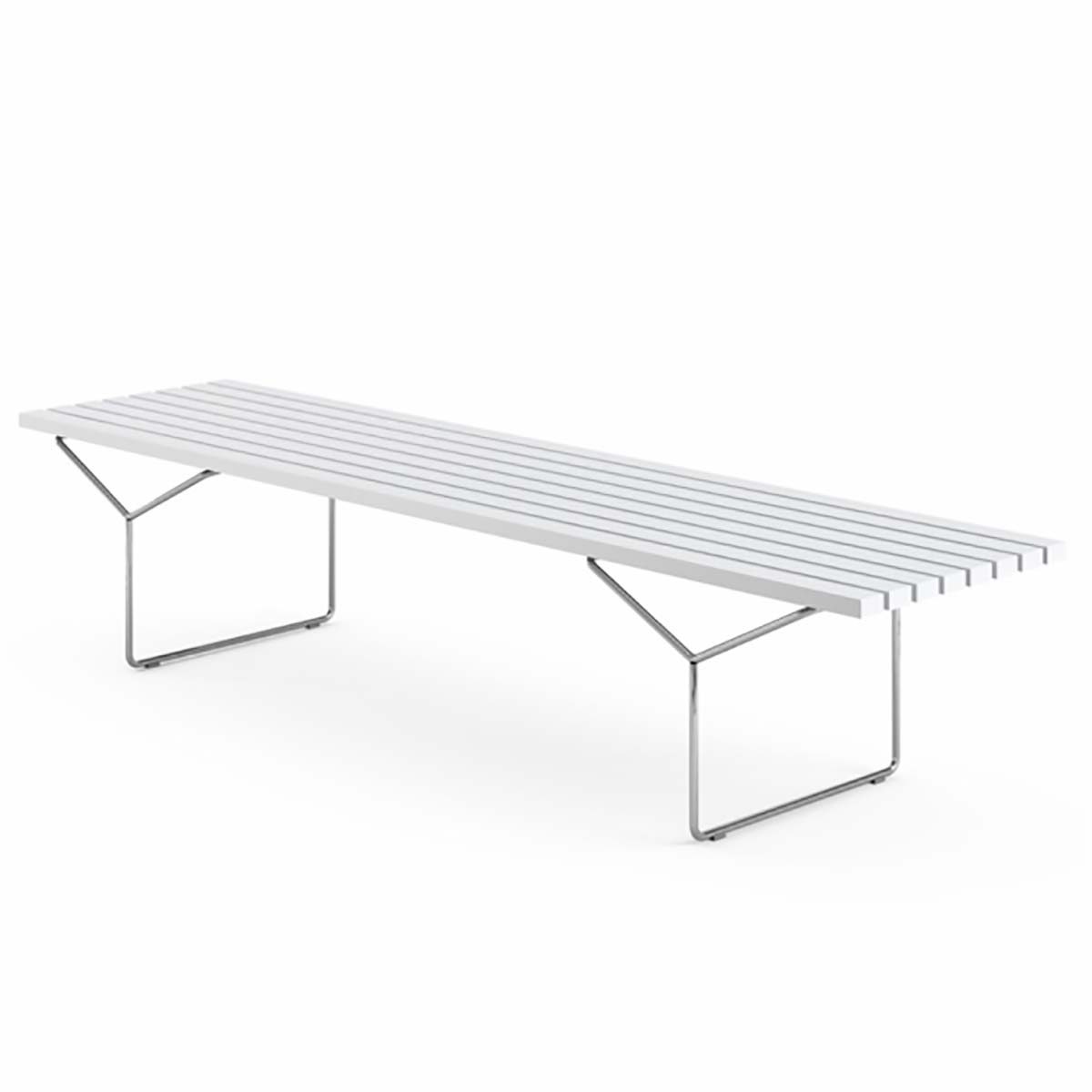 This simple design was the first piece of furniture created by Harry Bertoia for Knoll. Although the bench does not have the signature wire grid of his more recognizable 1952 collection, the welded wire base shows an early exploration of the material and foreshadows what was to soon follow.
