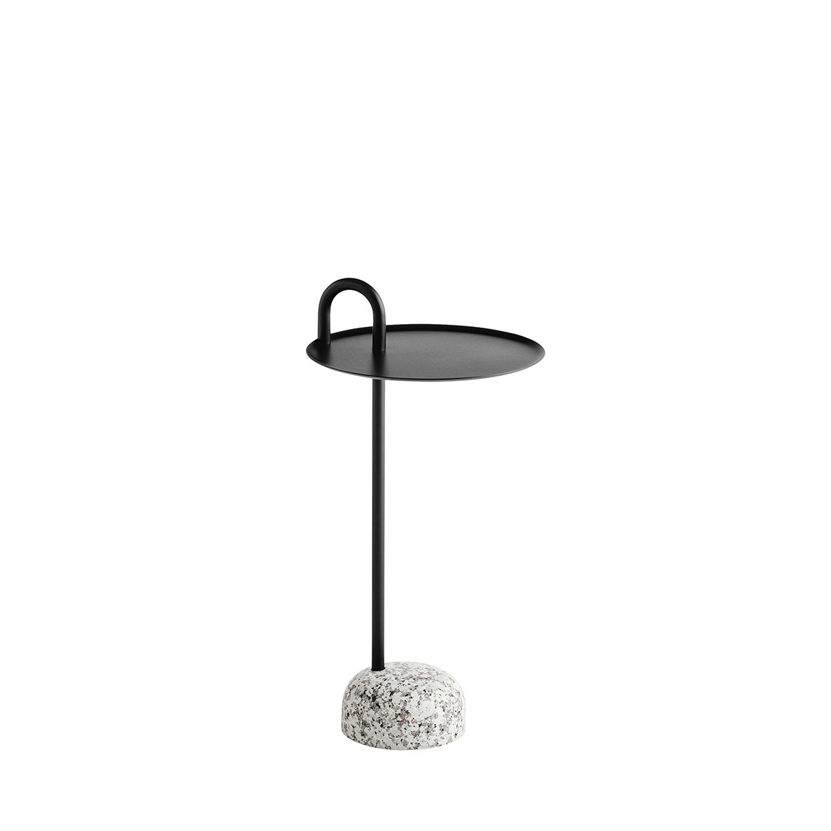 The Bowler Side Table from HAY features a powder-coated steel stem and tray paired with a solid granite base. Its unique arching tube detail adds an industrial touch and also functions as a convenient handle.