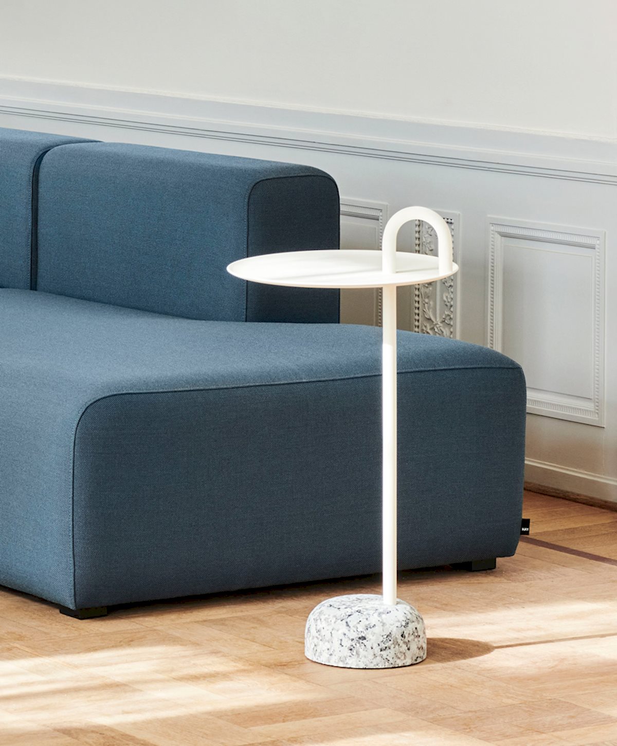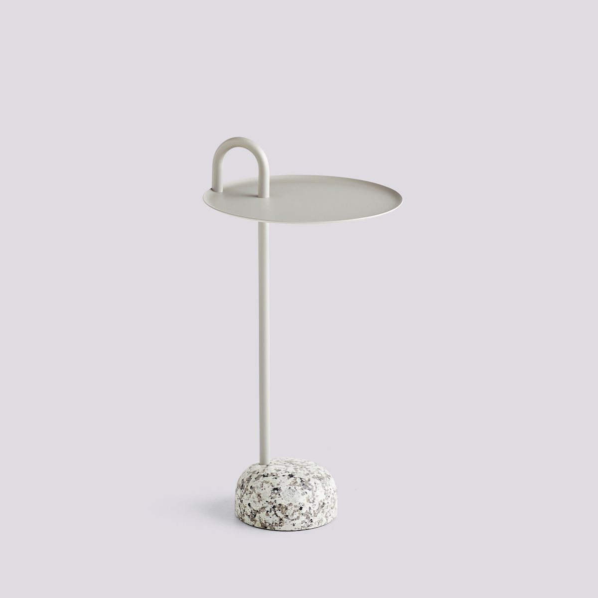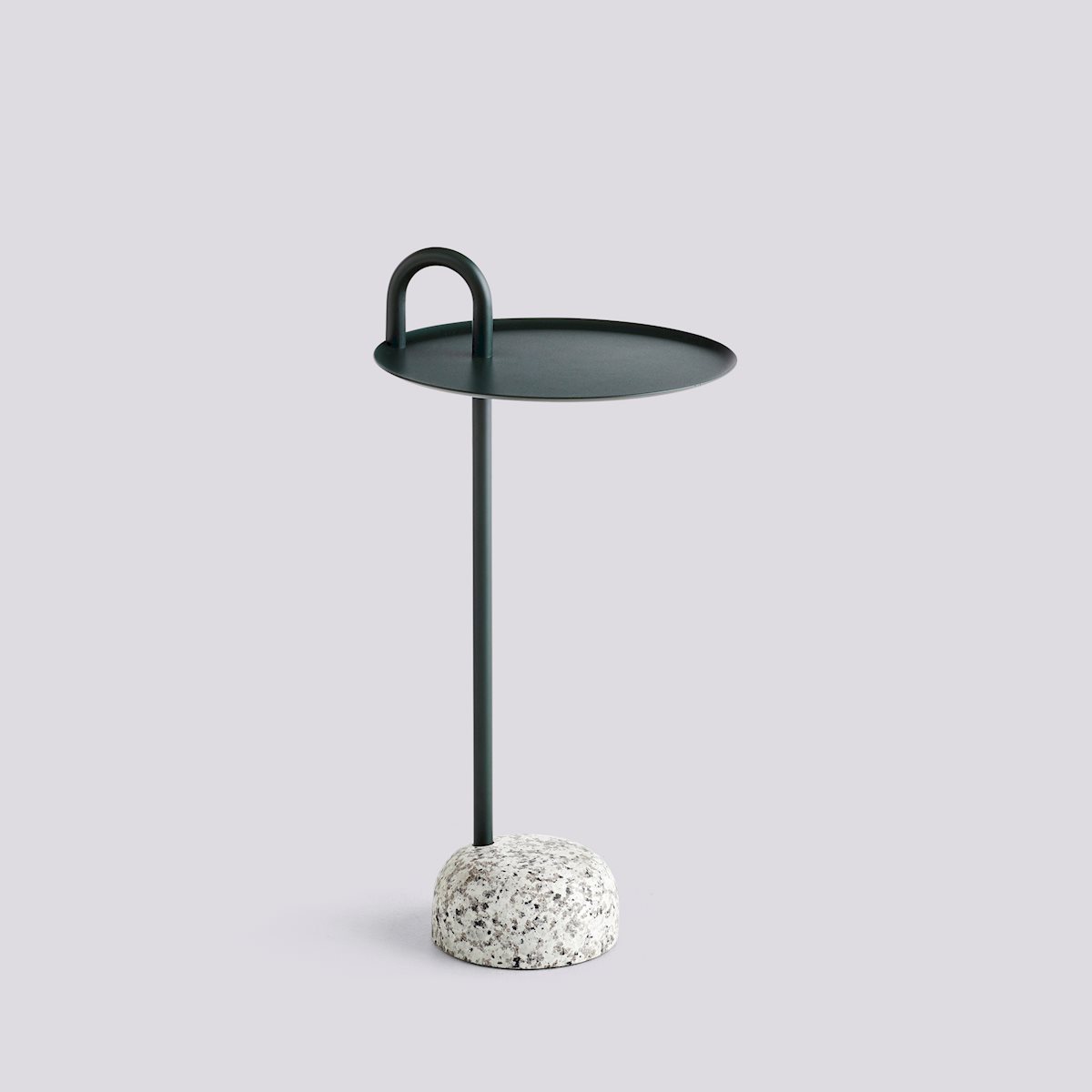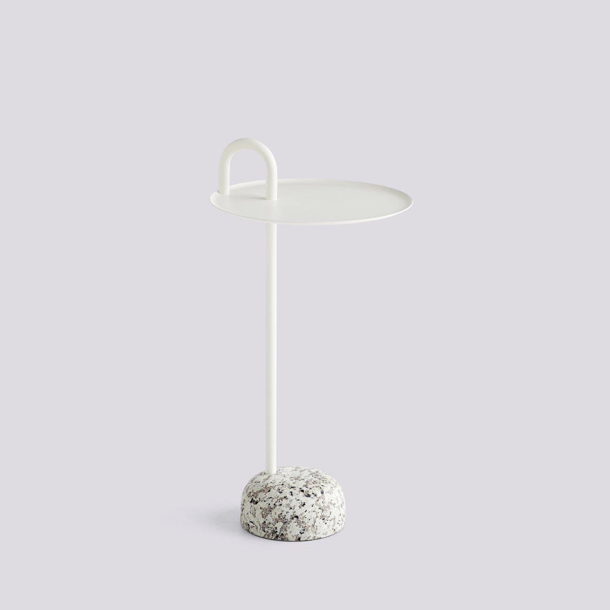 The Bowler Side Table from HAY features a powder-coated steel stem and tray paired with a solid granite base. Its unique arching tube detail adds an industrial touch and also functions as a convenient handle.
