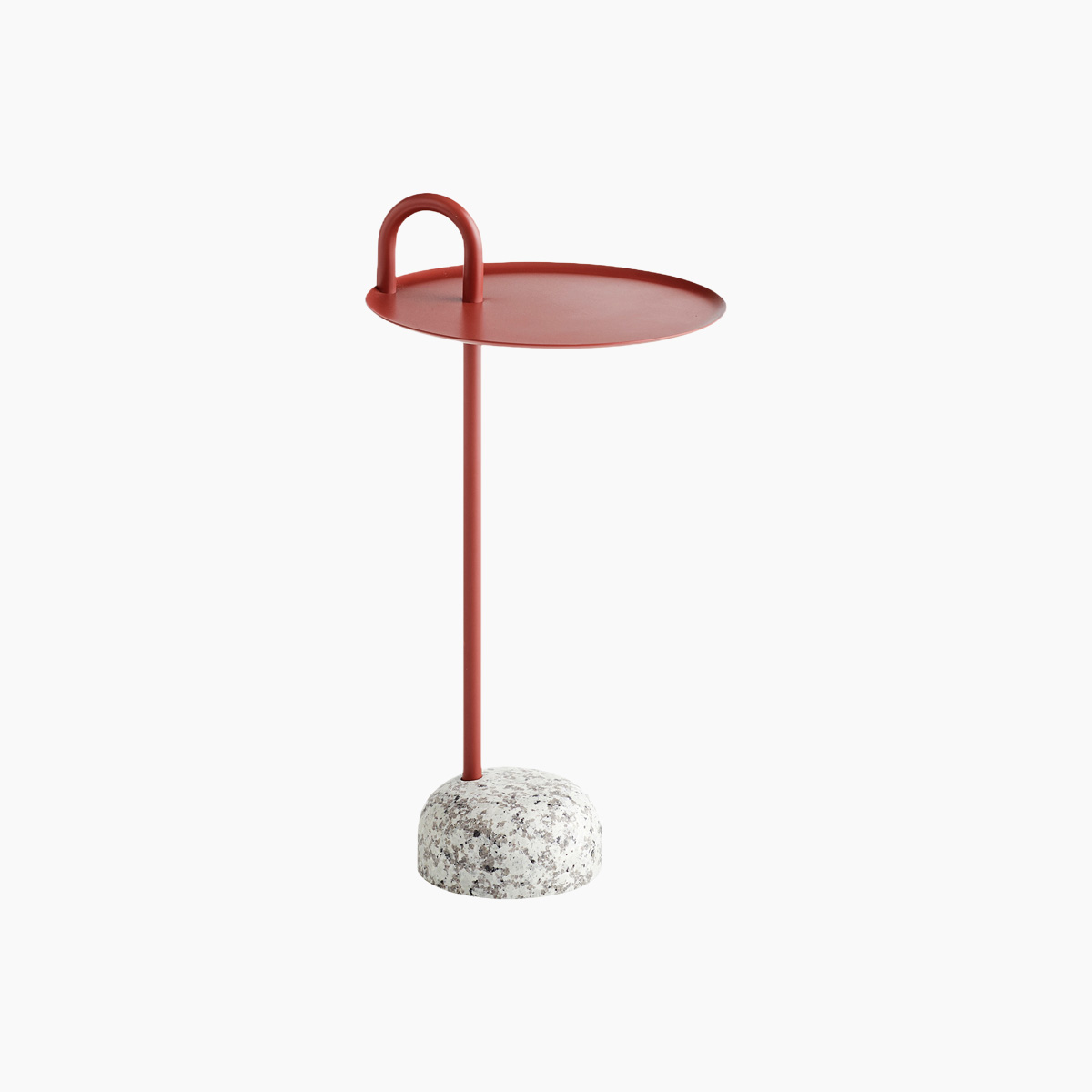 The Bowler Side Table from HAY features a powder-coated steel stem and tray paired with a solid granite base. Its unique arching tube detail adds an industrial touch and also functions as a convenient handle.