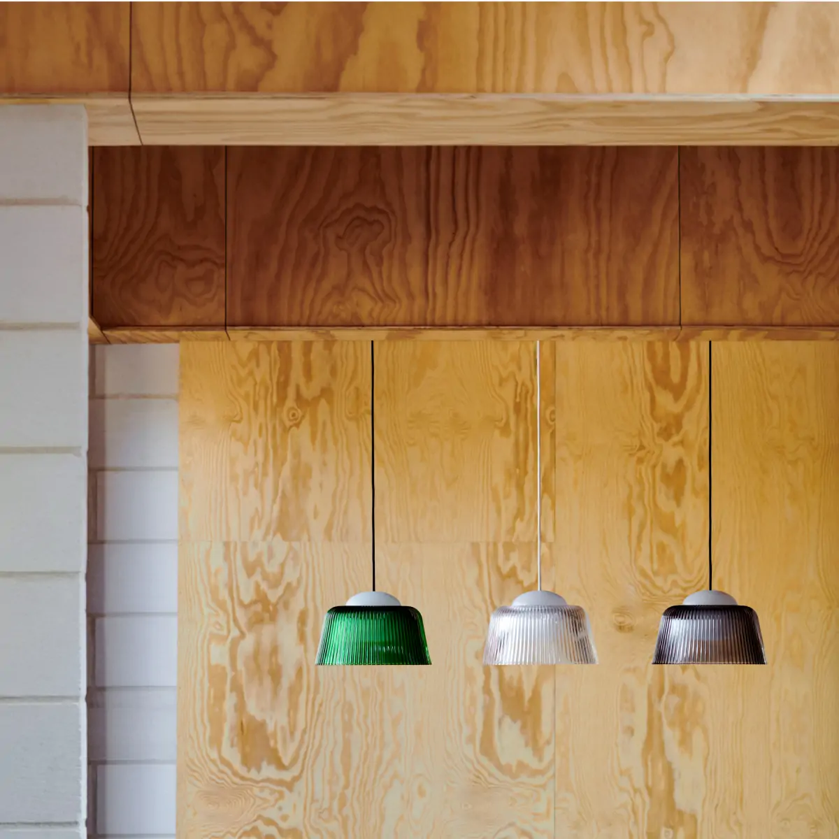Designed for HAY by Rui Pereira & Ryosuke Fukusada, Brim is an ambient pendant with a coloured pressed glass shade, inspired by classic glass pendants from past times. The familiar light typology has been updated in new materials and construction to optimise the function whilst retaining the pendant’s timeless aesthetics. The internal sphere conceals the bulbs, which is surrounded by a distinctive fluted glass shade that enhances the light diffusion. Available in a clear, smoked, and green glass variants, Brim’s compact size makes it ideal for hanging in clusters, as well as on its own in smaller spaces such as in hallways or over counters.