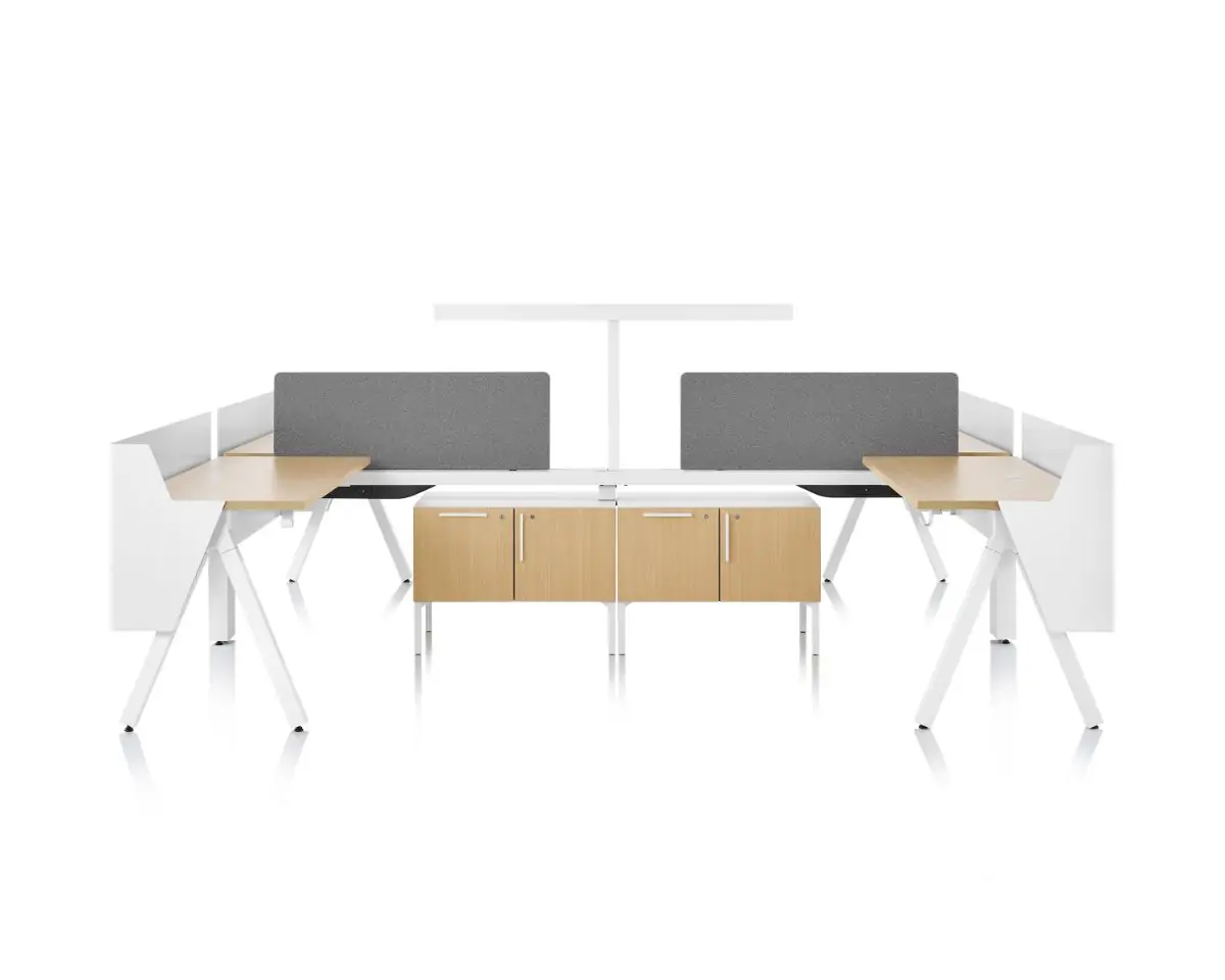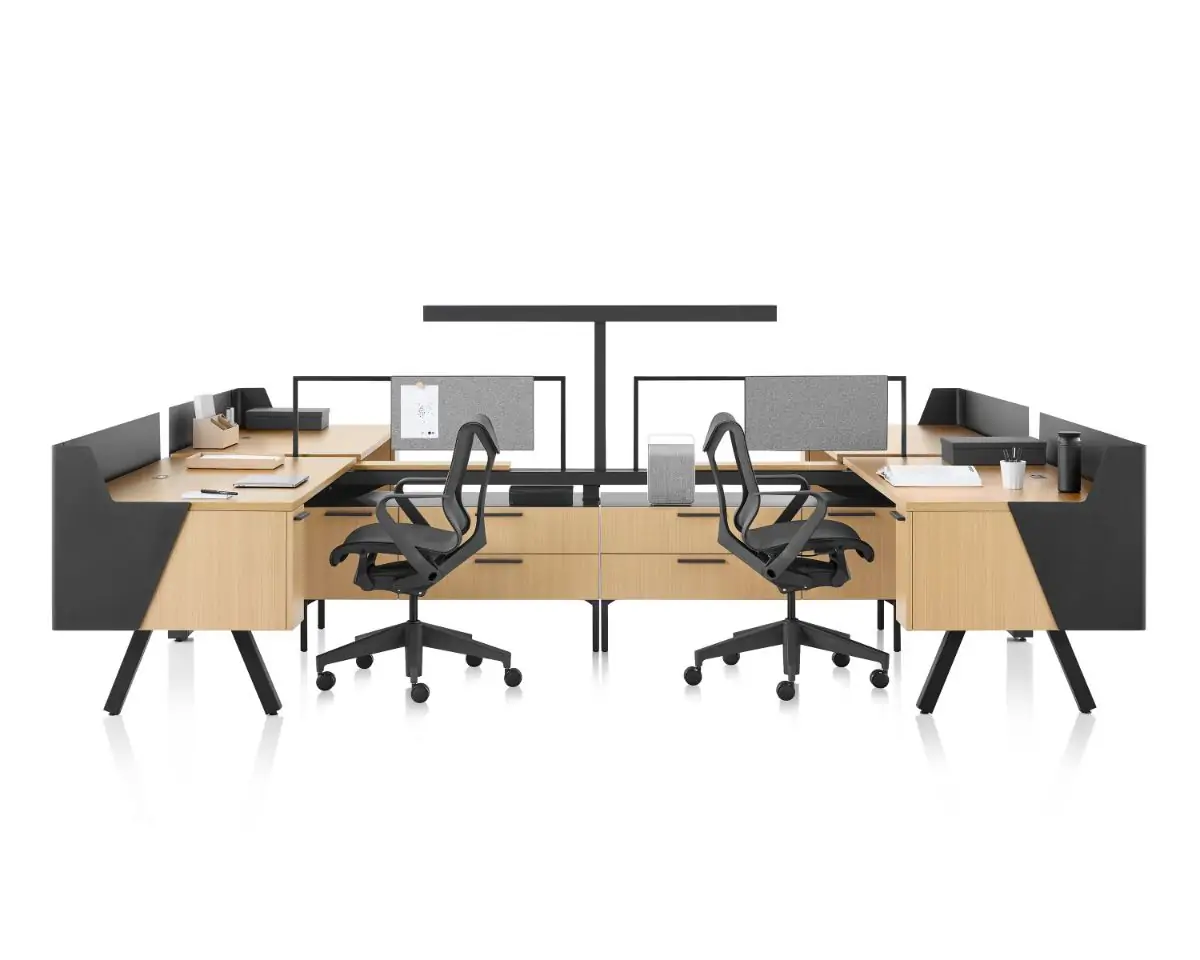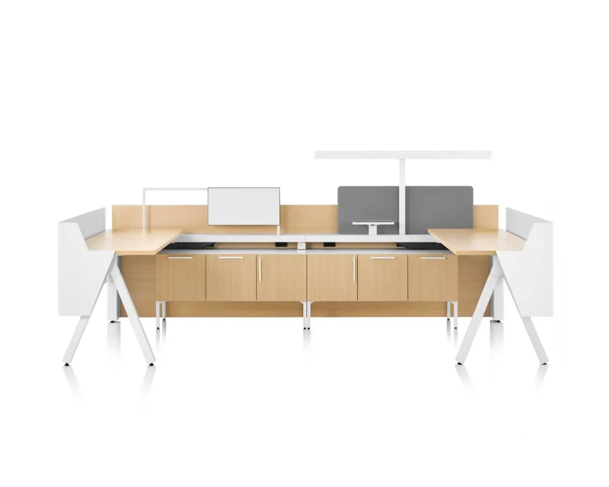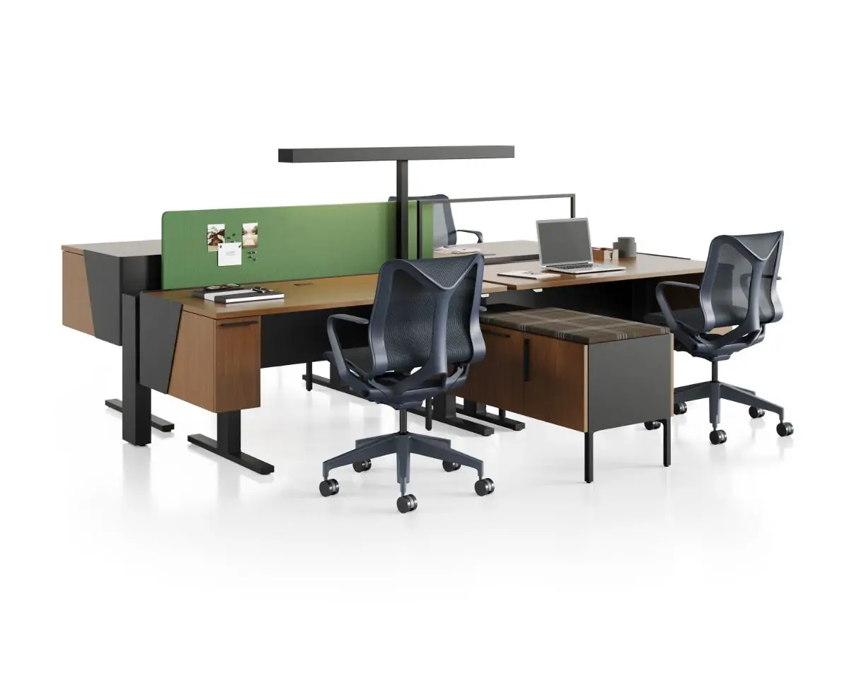 When workspaces are designed efficiently with people in mind, you feel less cramped and distracted. Move inserts into and out of the open-frame screens to dial in the privacy, stow away personal items in purposeful storage, and use T-shaped lights to imply boundaries.