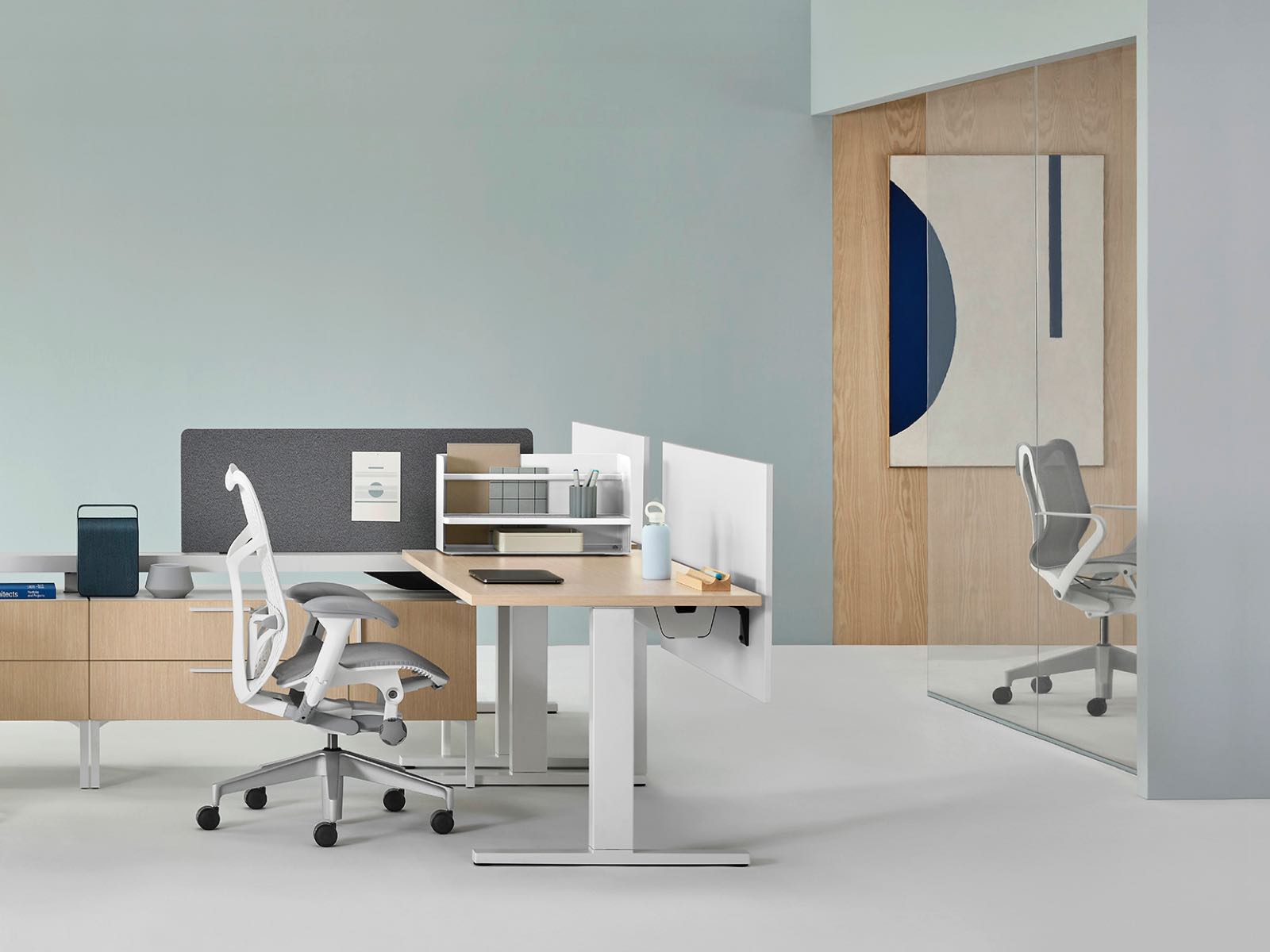 When workspaces are designed efficiently with people in mind, you feel less cramped and distracted. Move inserts into and out of the open-frame screens to dial in the privacy, stow away personal items in purposeful storage, and use T-shaped lights to imply boundaries.