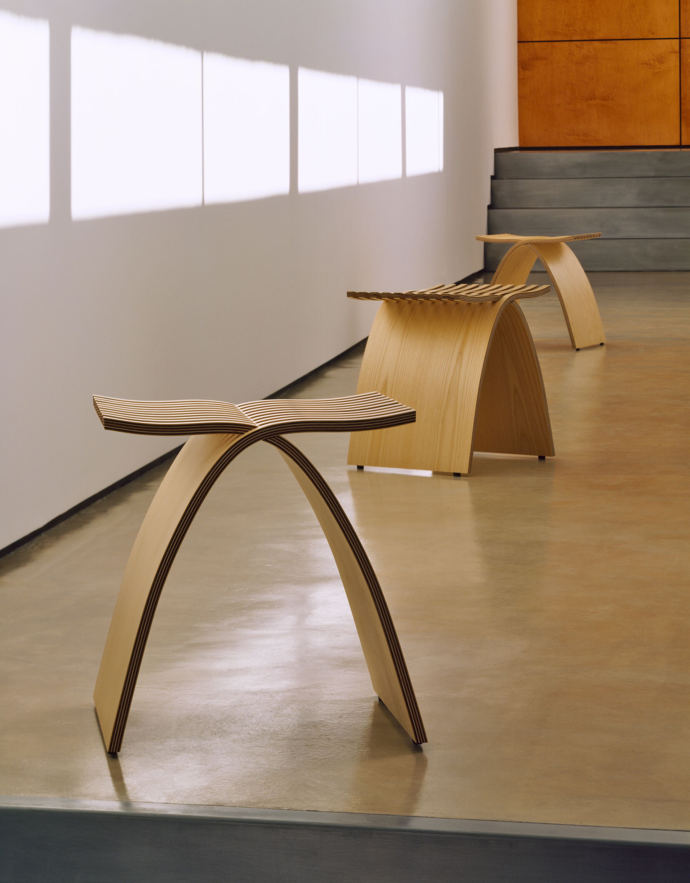 Each molded plywood piece is composed of alternating dark- and light-stained hardwood inner plies with a light ash veneer.
