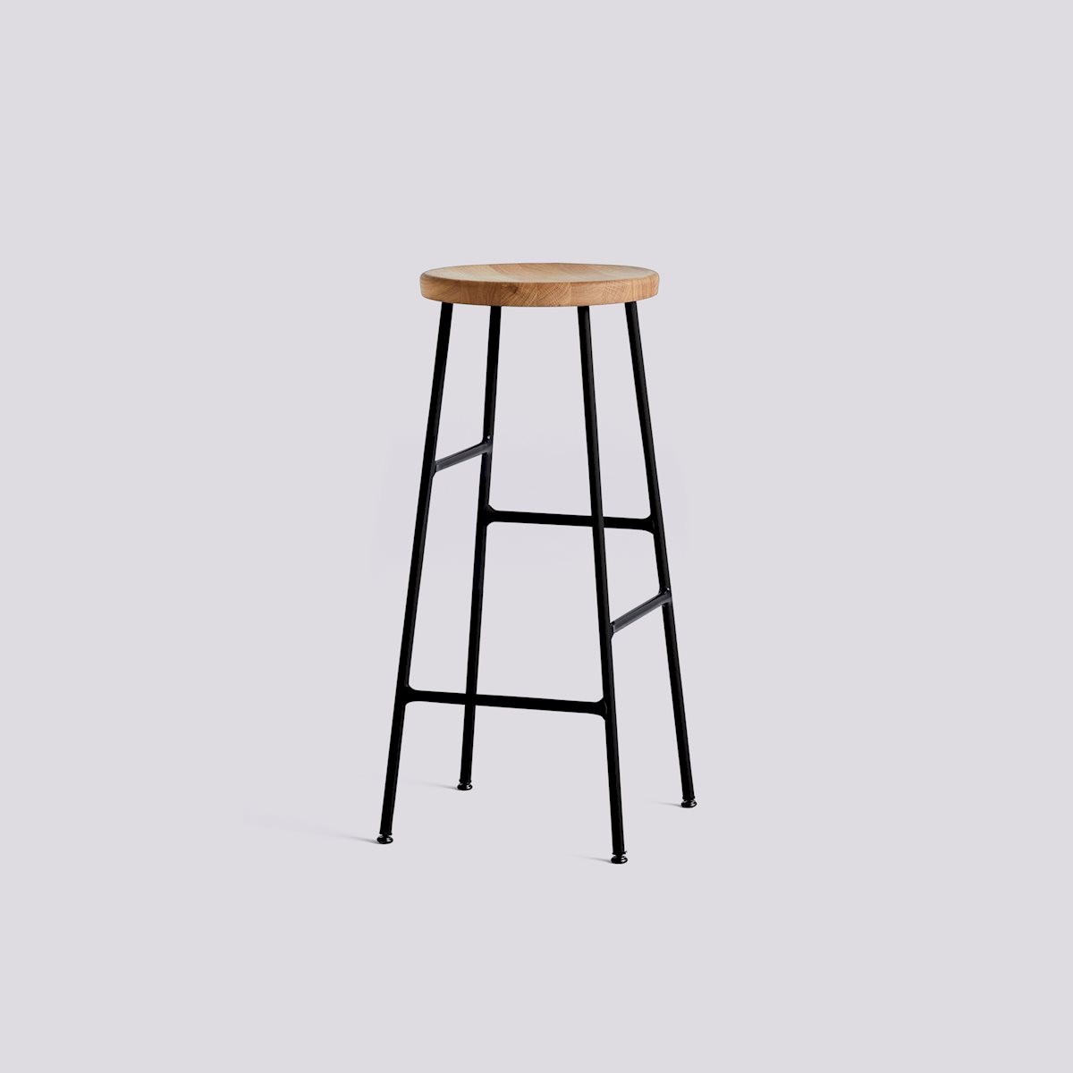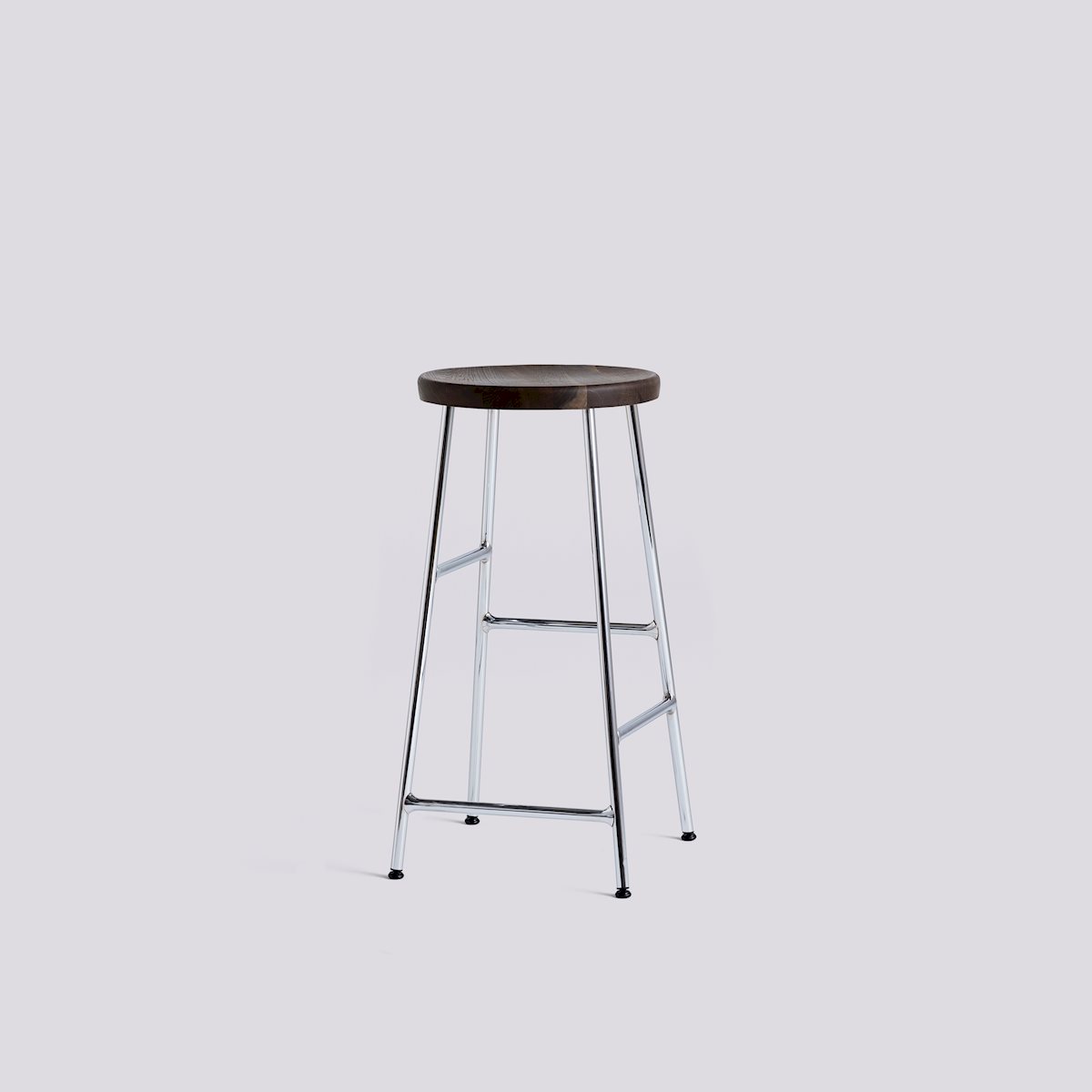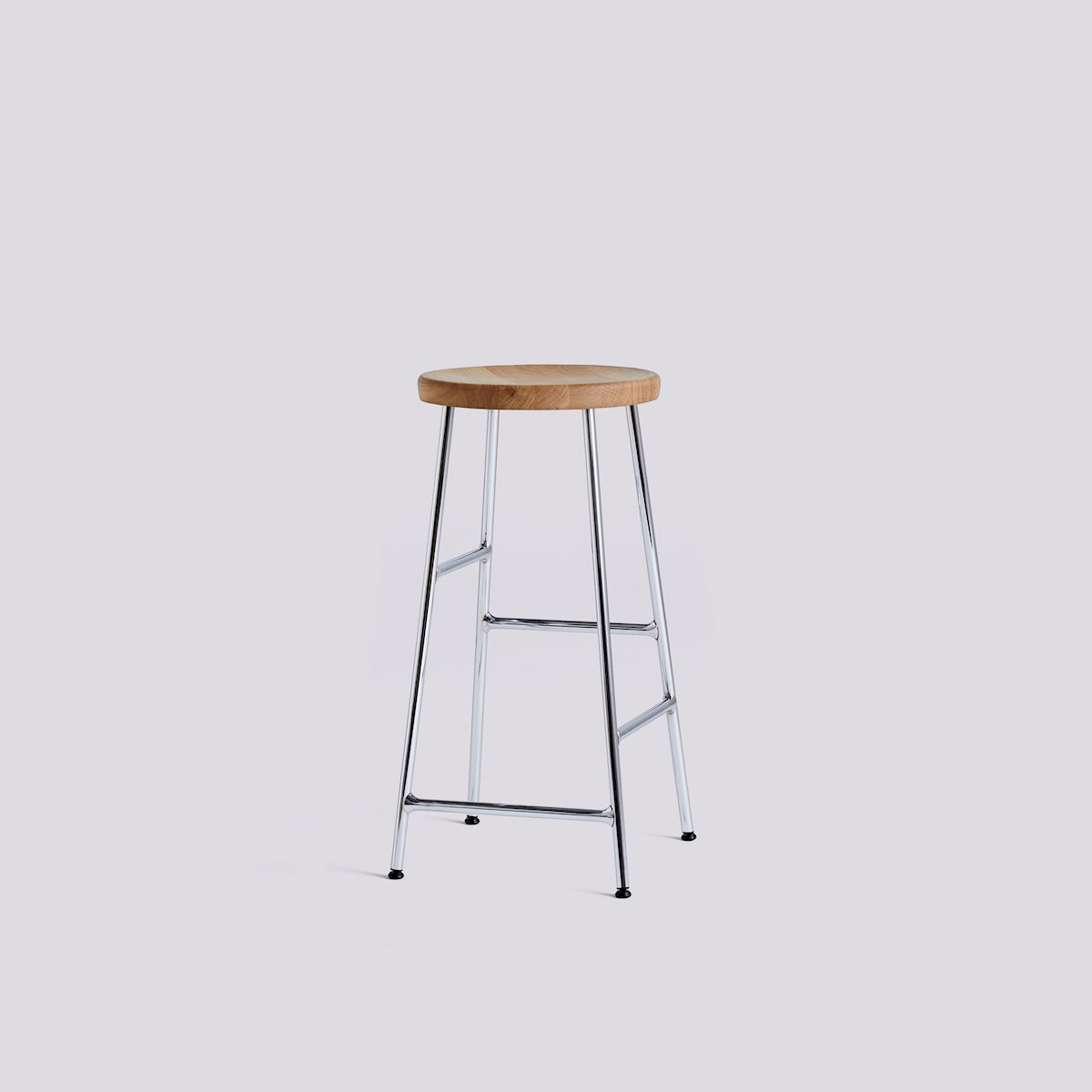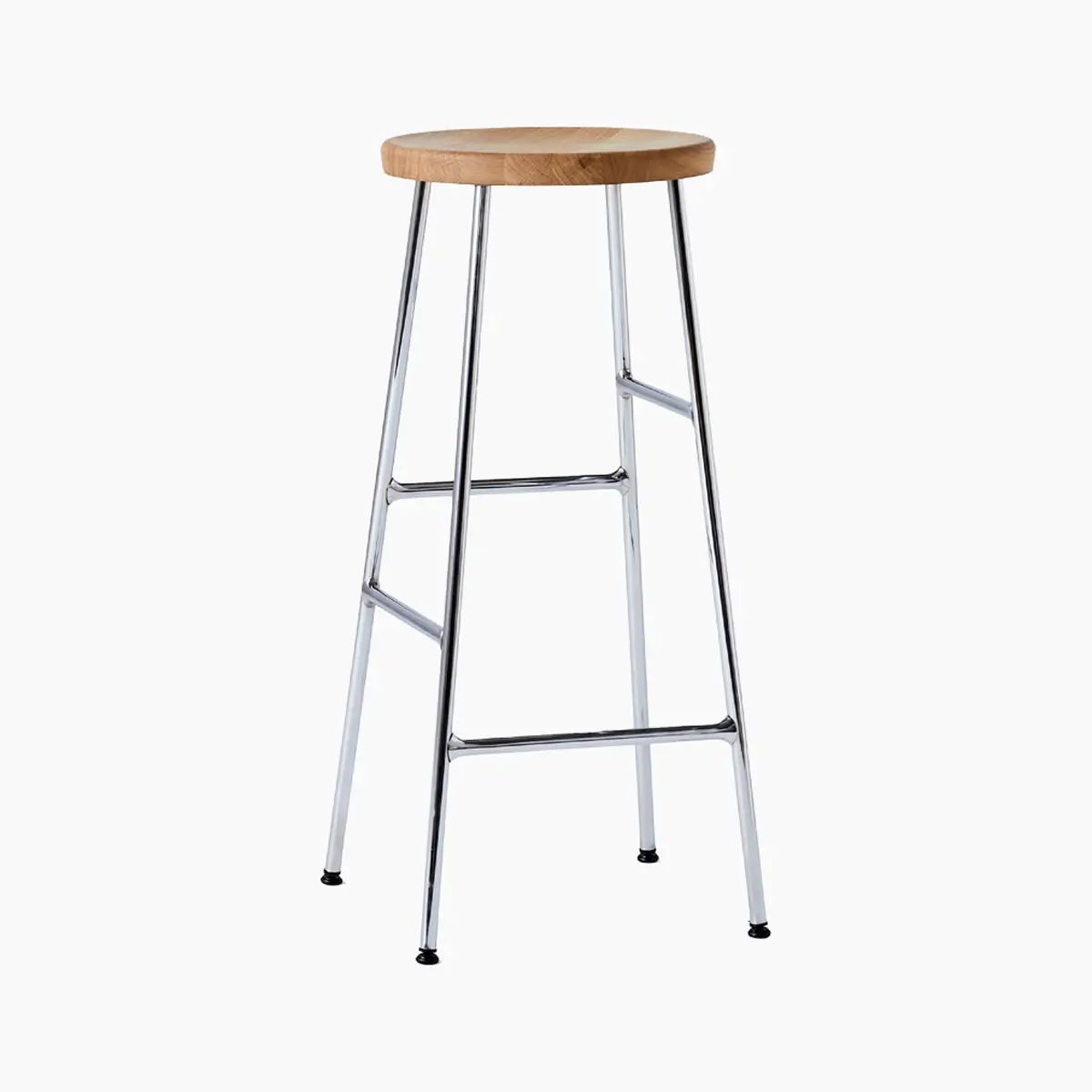 The Cornet Stool from HAY combines innovation and sophistication. Using a unique steel tube construction inspired by bicycle racks, this stool features footrests at different heights on each side to accommodate diverse users. It comes in bar- and counter-heights and features a solid wood seat for a sleek balance of form and function. Choose from various wood finishes and chrome or powder-coated legs to complement any setting, whether office, lounge, or dining space.