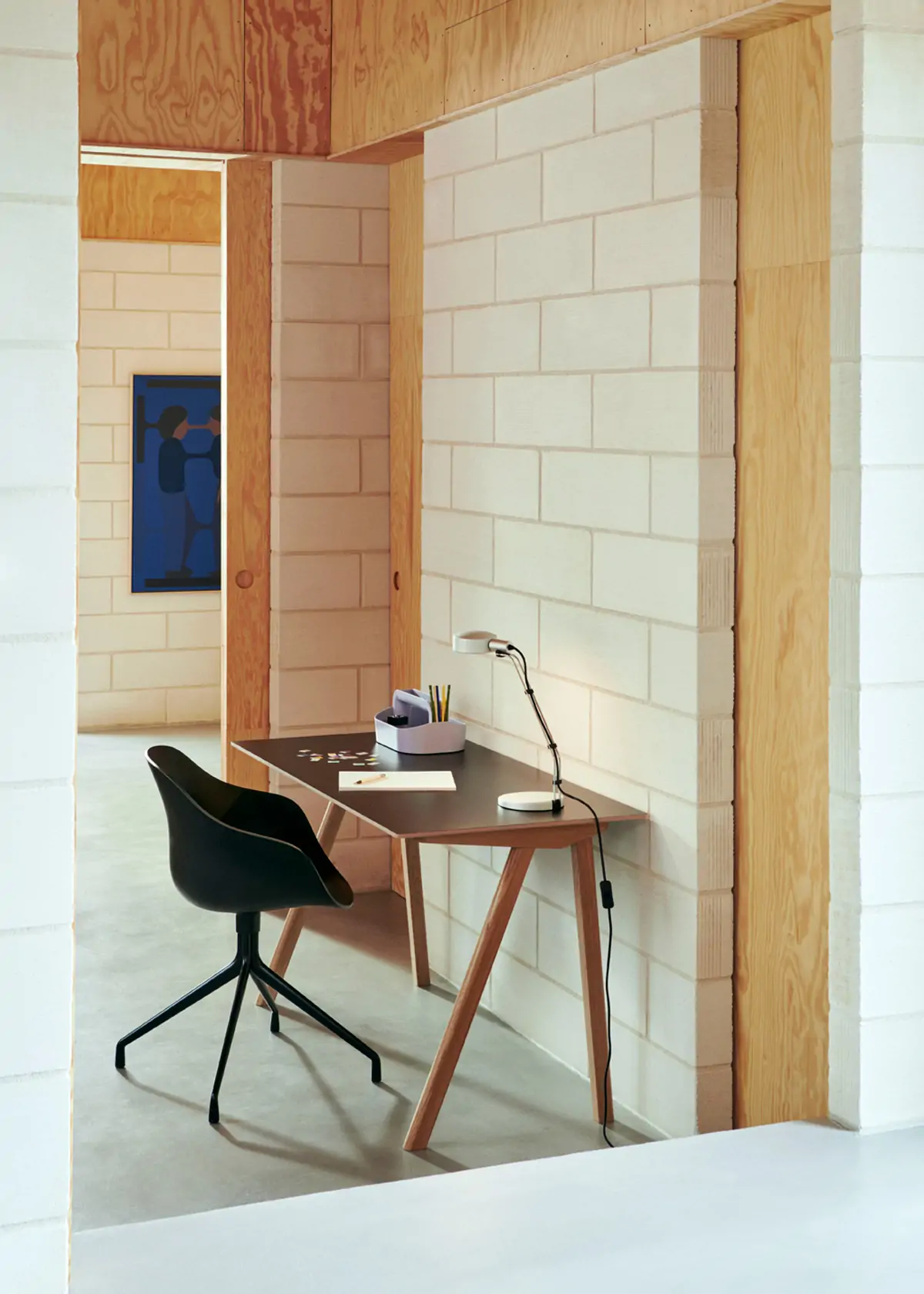 The CPH 90 brings classic desk aesthetics into a modern context. The Bouroullec brothers’ simple yet graceful asymmetrical legs coupled with the streamlined tabletop results in a functional, compact, and uncluttered design. It is available with tabletops and frames in a variety of wood types and materials, with the possibility to select matching or contrasting combinations. The Copenhague Desk’s versatile and elegant design makes it suited to a variety of corporate environments, as well ideal for working at home.