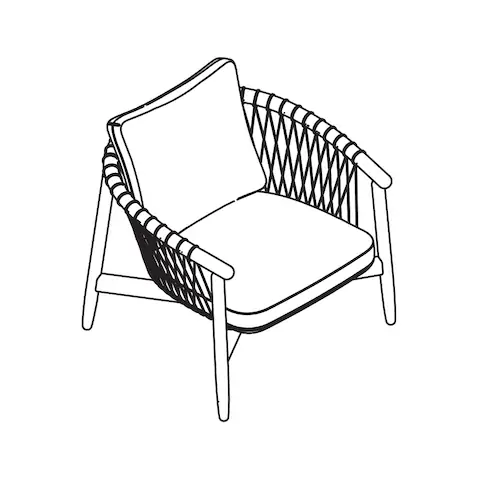 Parachute cords, a common industrial product, are an integral part of the chair’s design. Pulled down, the cords create a system of internal tension and supply the necessary back support, creating the feeling of being enclosed in a comforting, protective nest. The parachute cord is available in several colors, the frame in a selection of natural woods. Because of their simple, classic profiles, the Crosshatch Chair and Ottoman can work in a broad range of environments, from an executive office or a reception area to a penthouse or suburban living room.