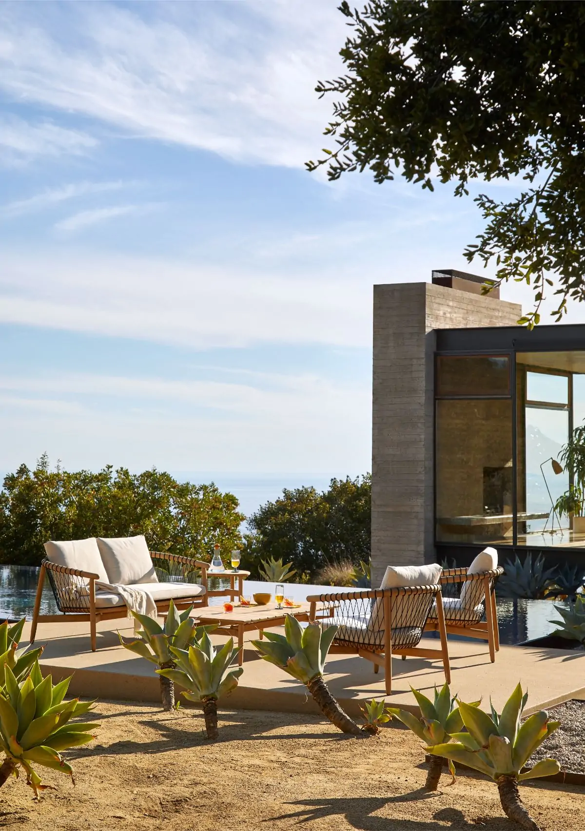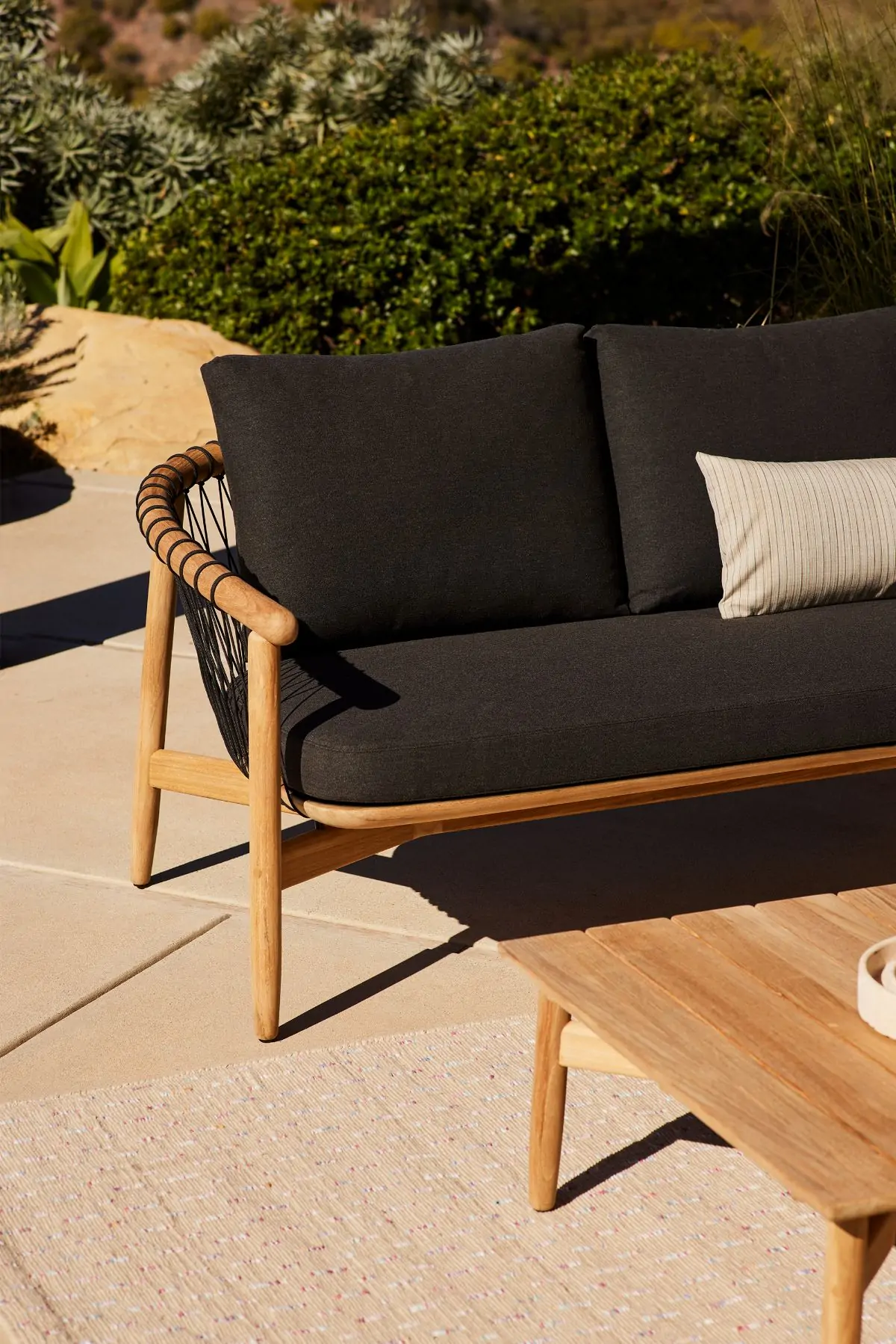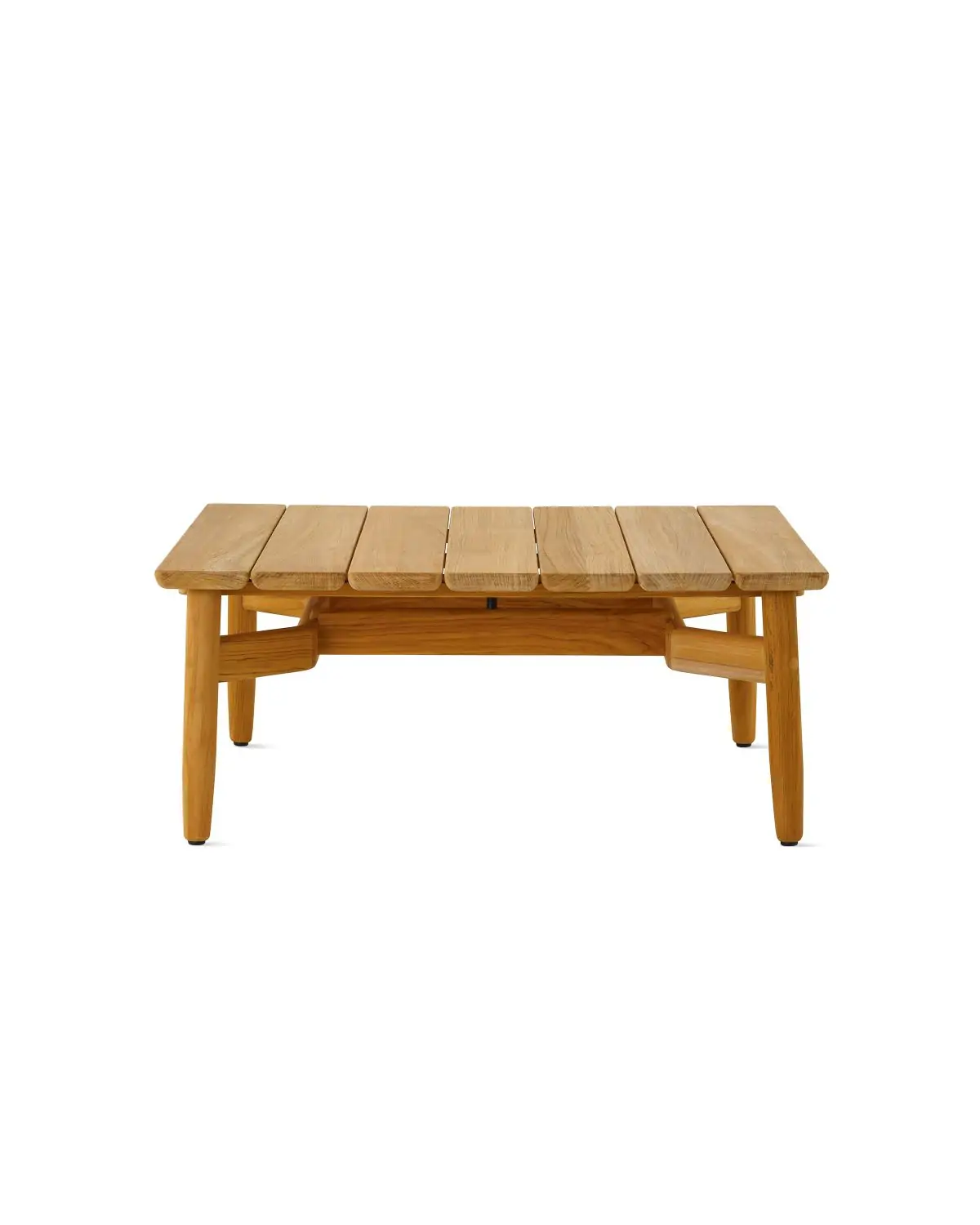 The coffee table is marked by a hallmark of the Crosshatch family: sophisticated wood joinery—for this piece, in teak—by design firm EOOS.